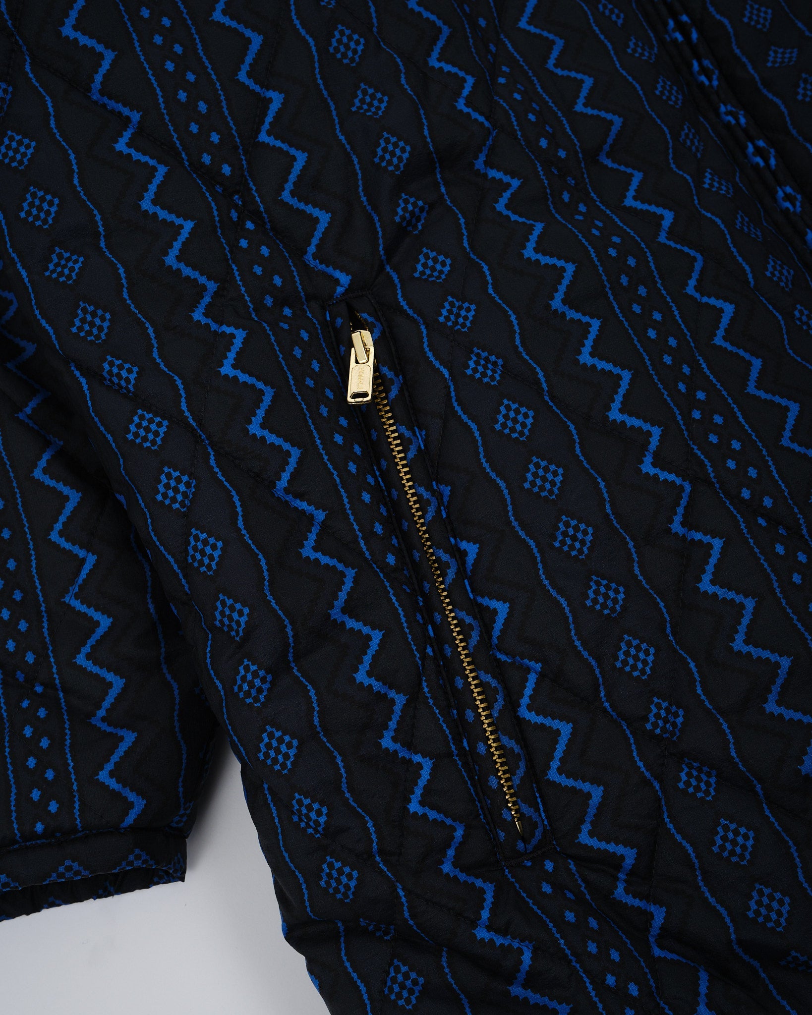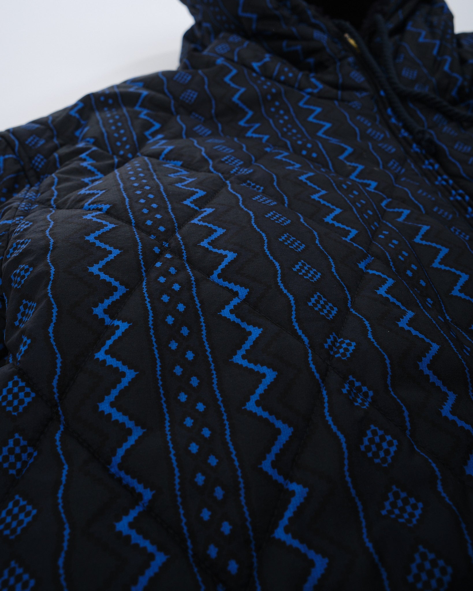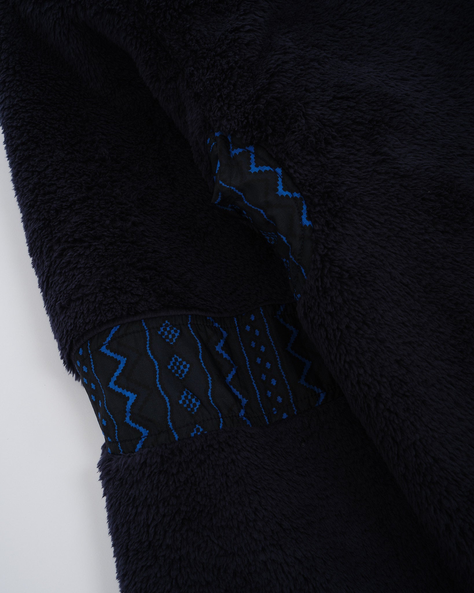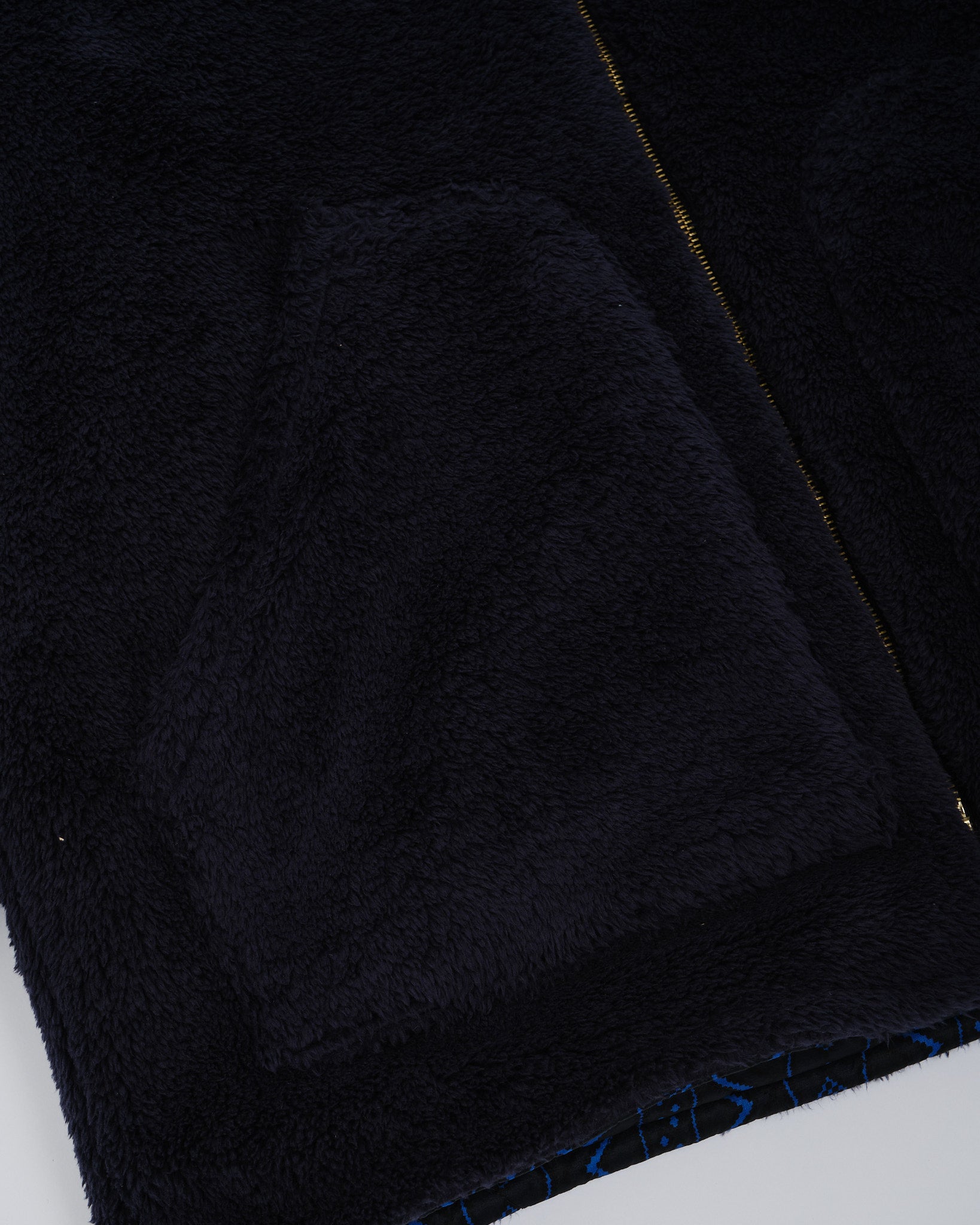Dit is een volledig omkeerbare, zwart en marine geometrische jas. De ene kant is gevoerd met een pluizige zwarte stof, en de andere kant is gevoerd met een marine en zwart geometrische print. Twee zakken aan beide kanten van de jas. Normale pasvorm. Gemaakt in China.