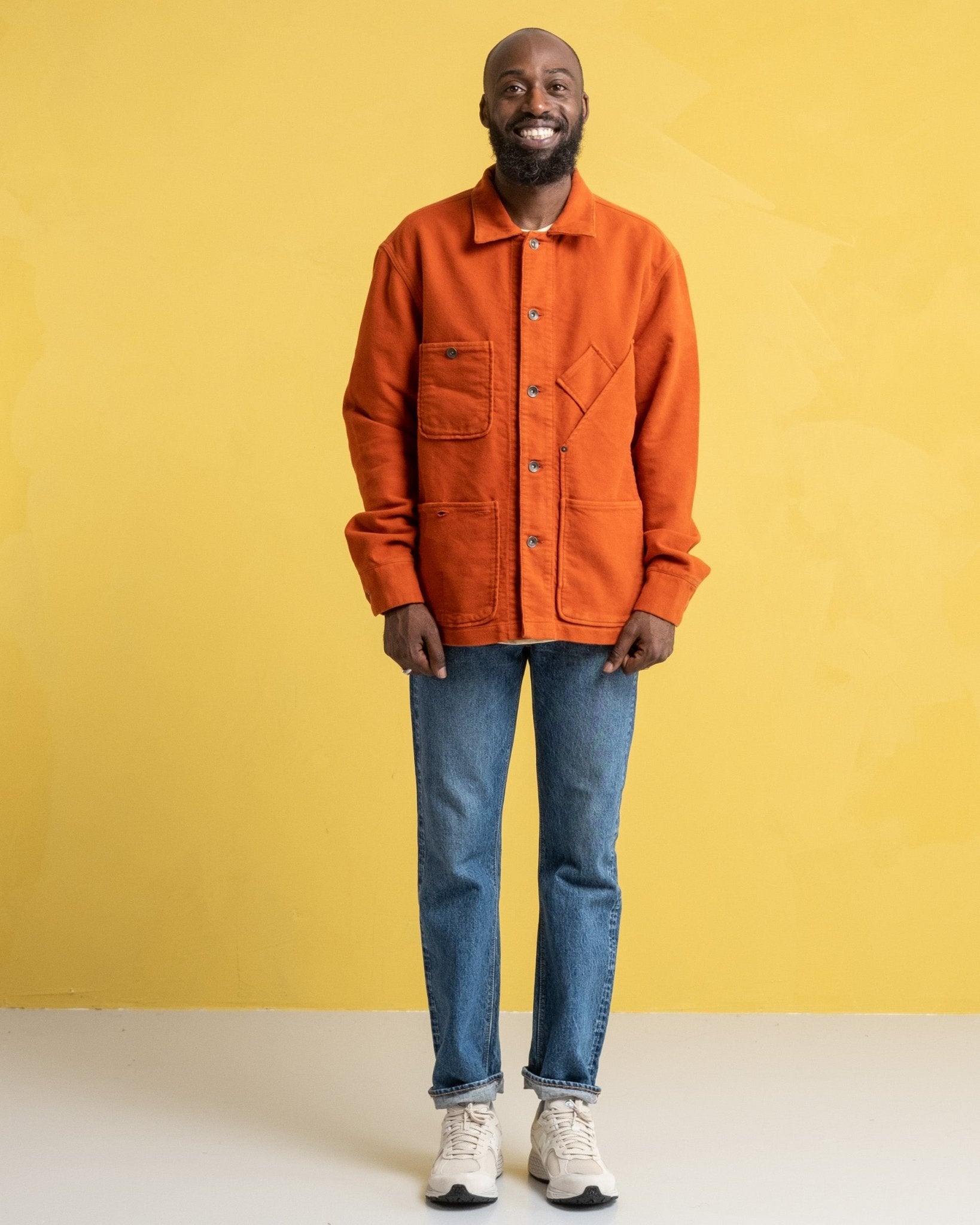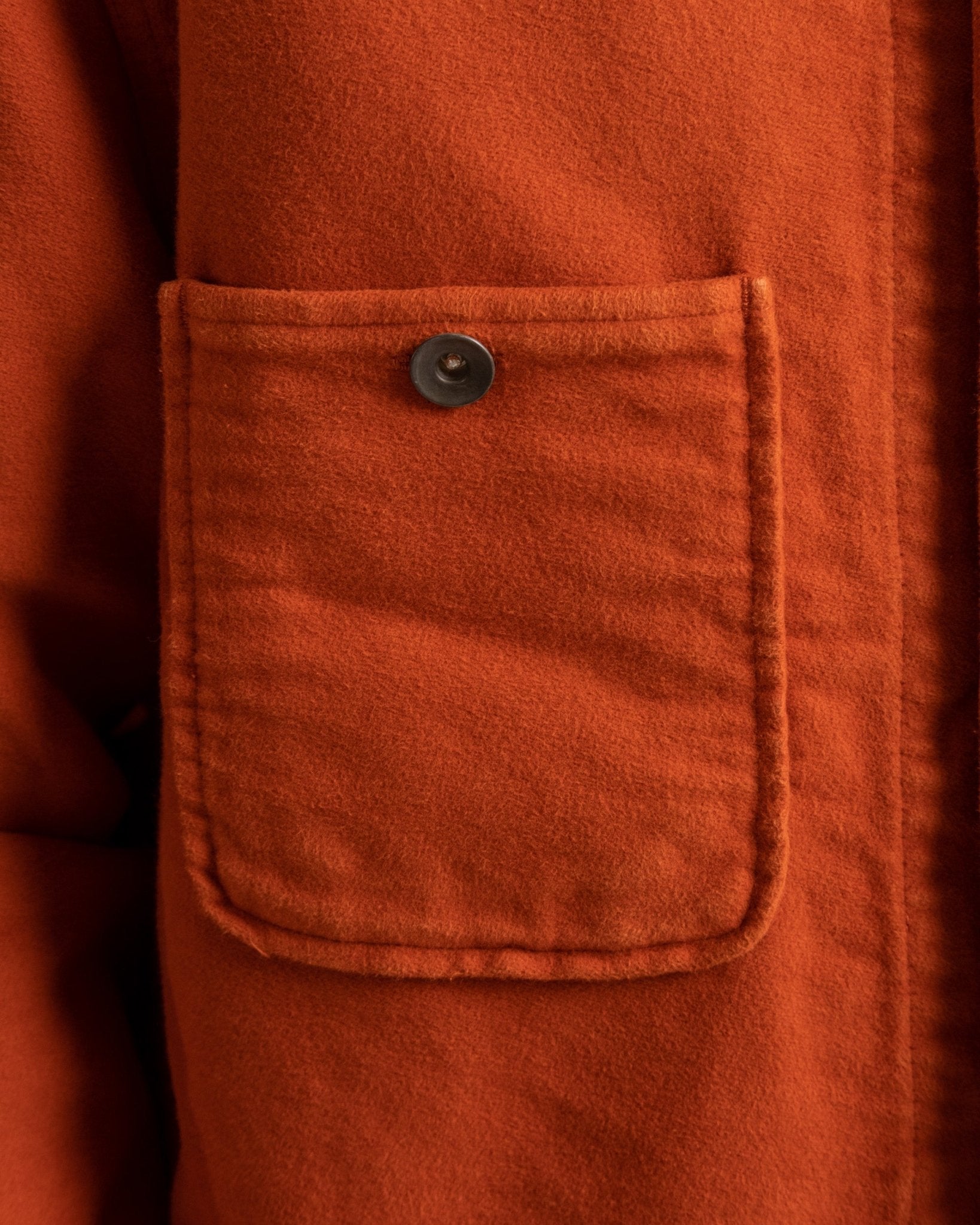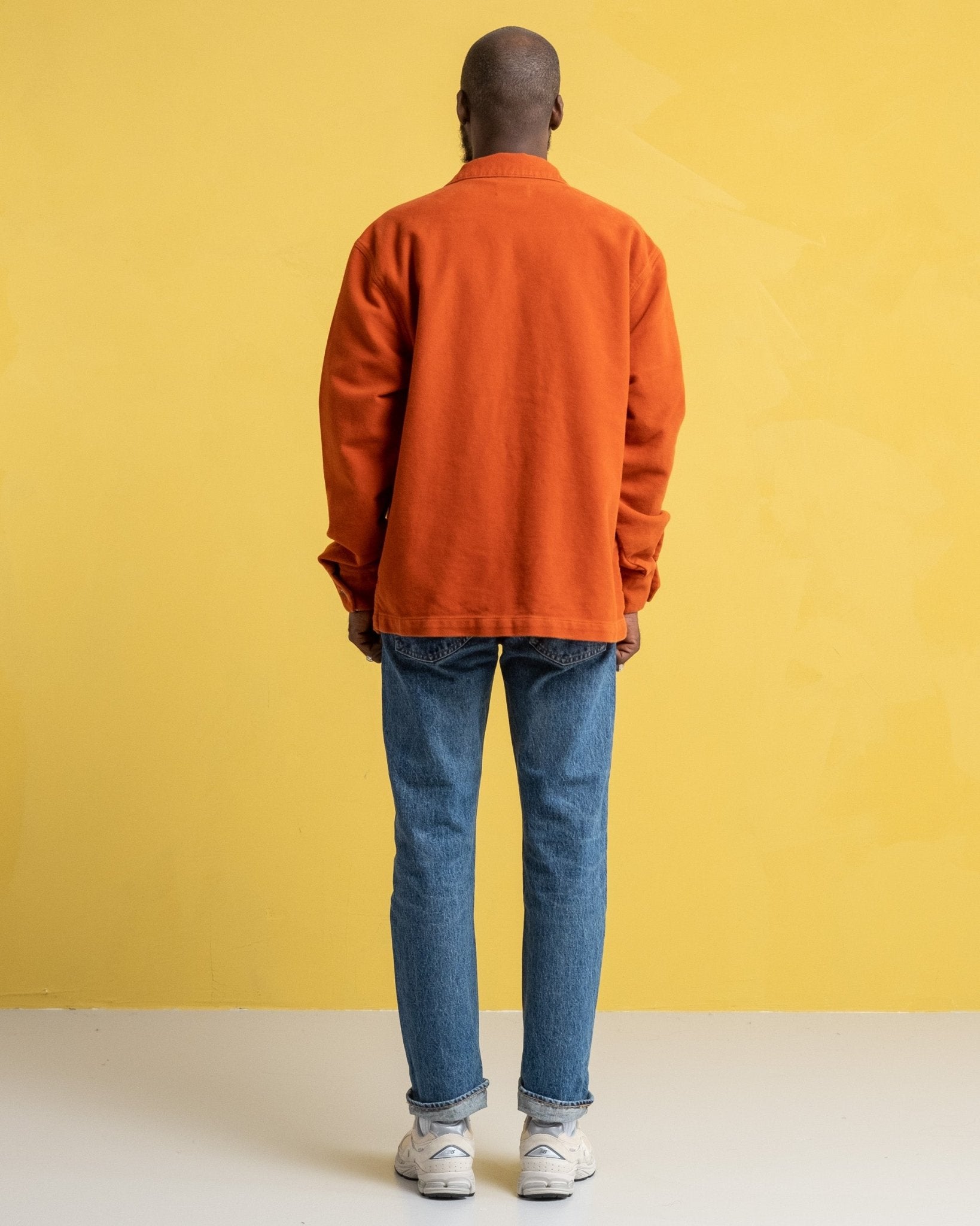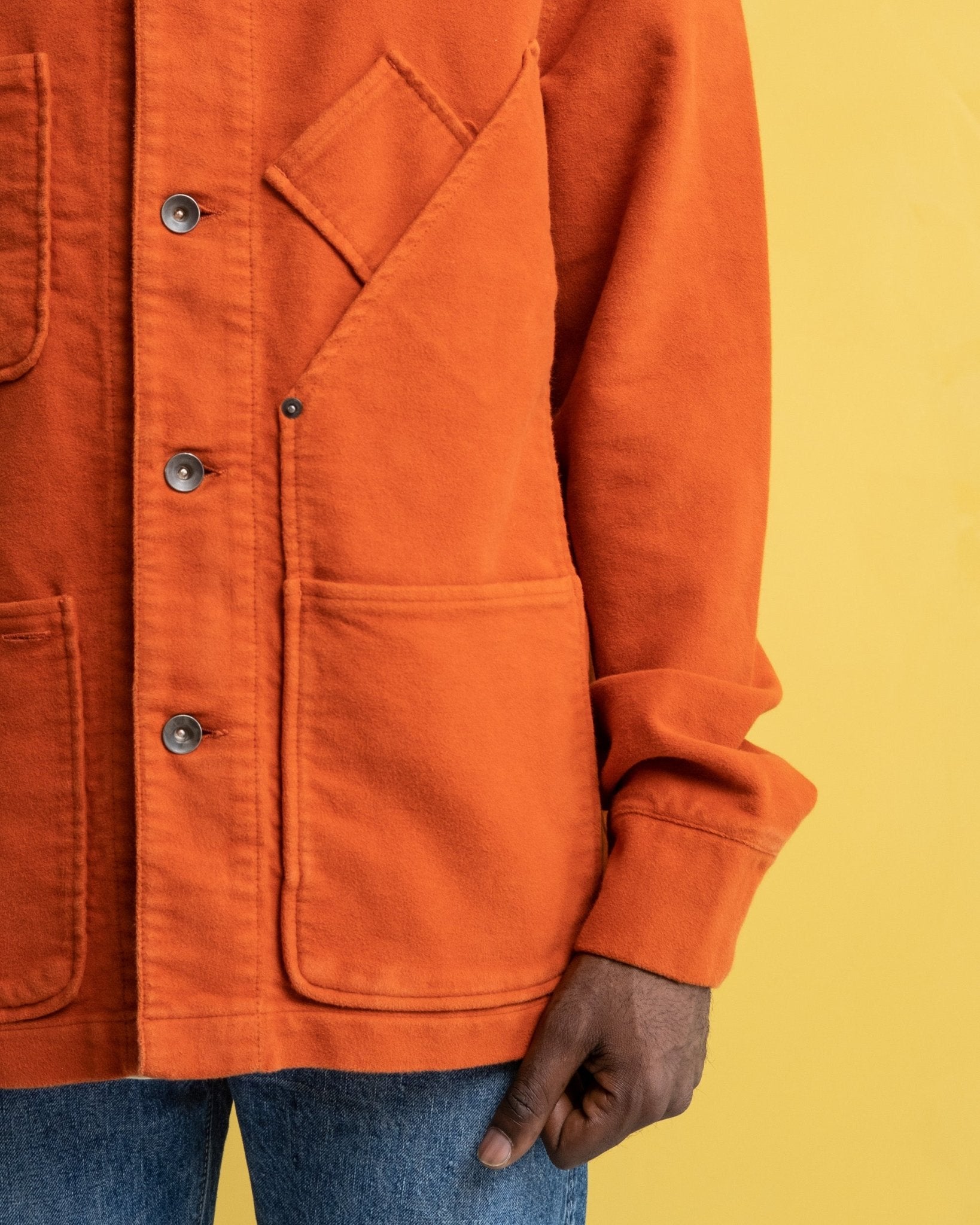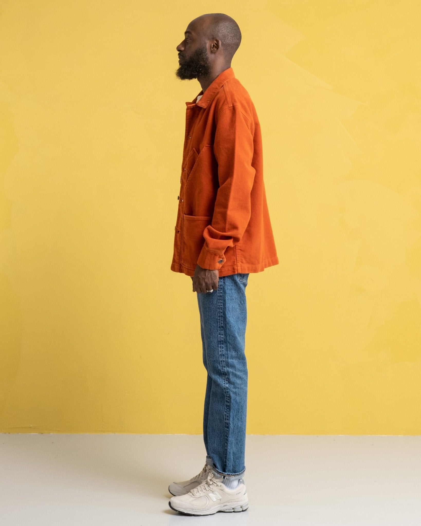 Coverall Jacket International Orange van Tellason gemaakt van een mooie 13,5 oz Amerikaanse moleskin, genaaid in San Francisco. Vier grotere buitenzakken en een brillenzak aan de voorkant samen met één binnenzak. Wordt steeds mooier hoe meer je het draagt. Metalen knopen aan de voorkant en aan de manchetten. Kledingstuk geverfd. Gemaakt in de VS.