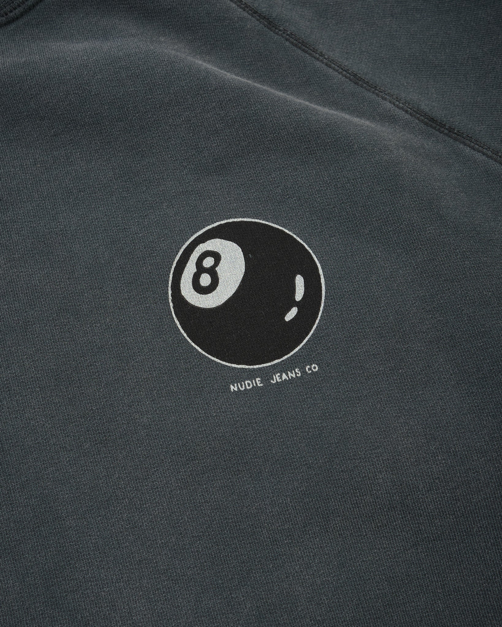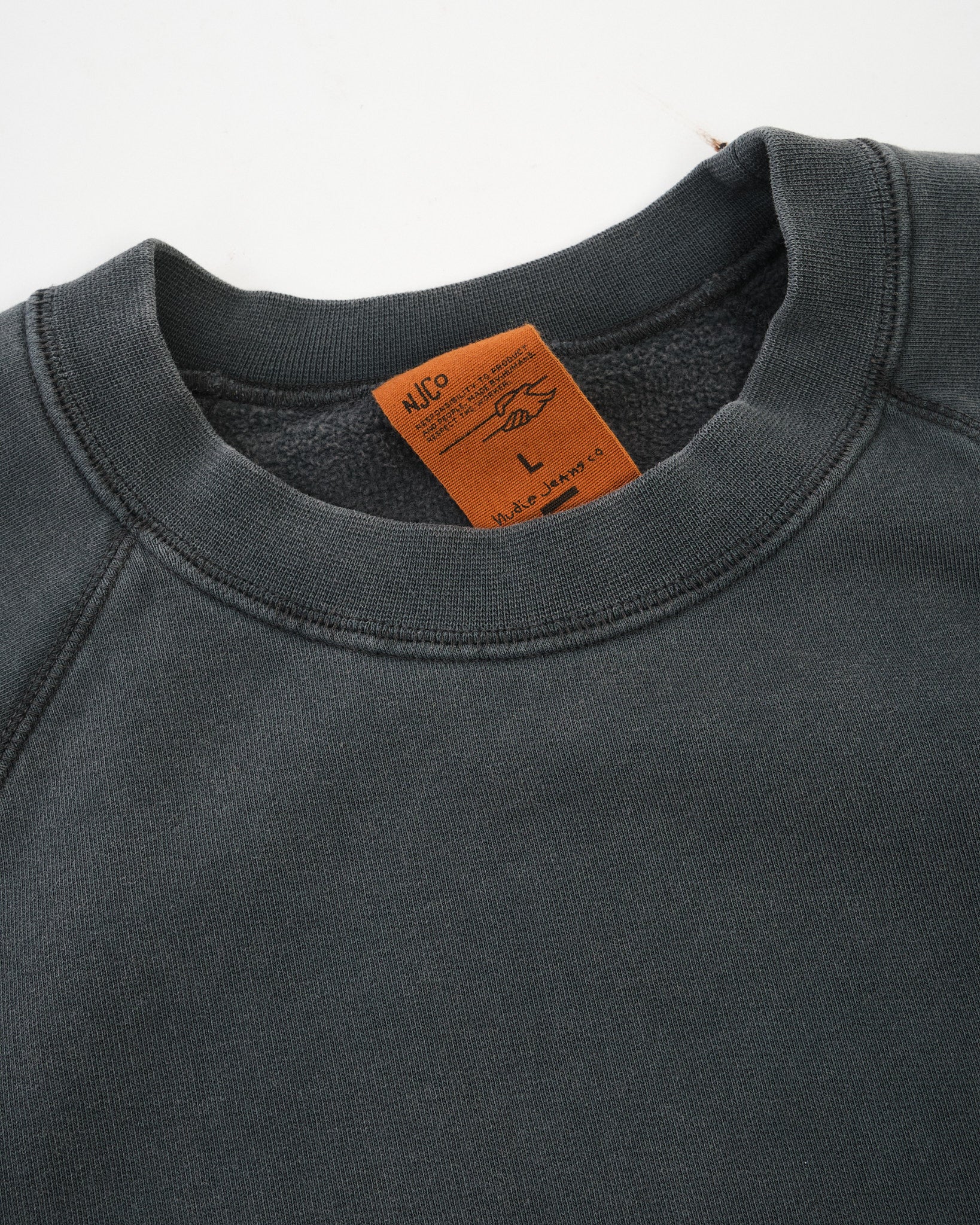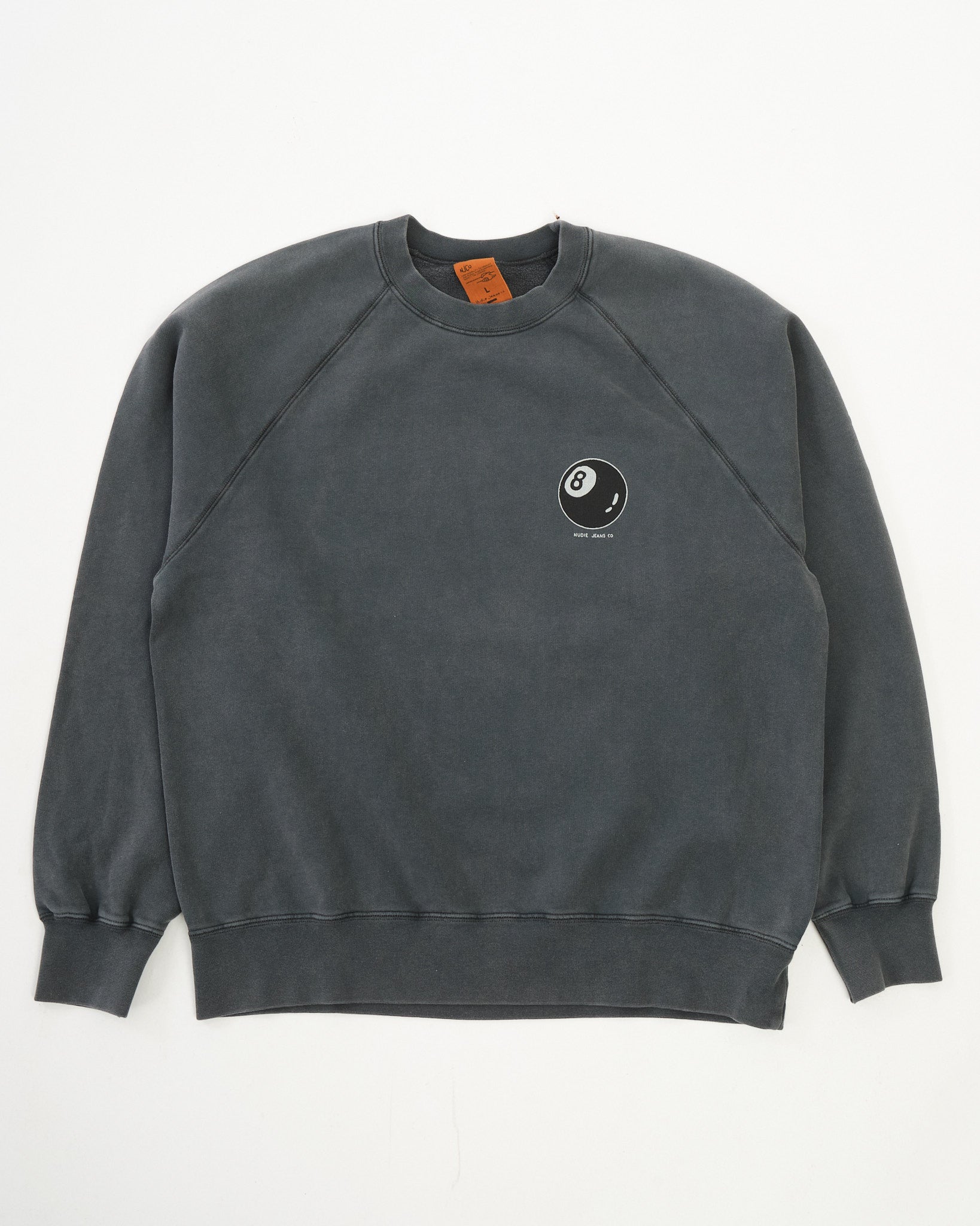 The sweatshirt is garment dyed and fade-out washed to achieve its faded antracite tone, giving it a gently worn-in appearance with subtle variations in colour. Designed with raglan sleeves, flatlock seams, and rib-knit cuffs, it offers a clean, relaxed silhouette with practical comfort.