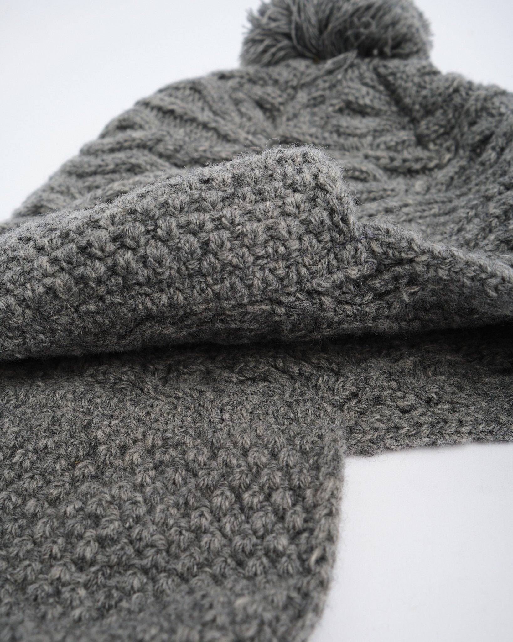 The Pom Pom Beanie in Grey by Found Feather delivers playful charm with premium construction. Made in Japan from a washable lambswool blend, this cold-weather essential features a 3x cable knit pattern for rich texture and structure. An oversized 20 cm crown, 11 cm ear panels, and a soft self-yarn pom pom ensure both warmth and whimsy. With a 23 cm diameter and unisex one-size fit, it's finished with a QR-coded care label and a clean woven tag — proof that fun and functionality can go hand in hand.
