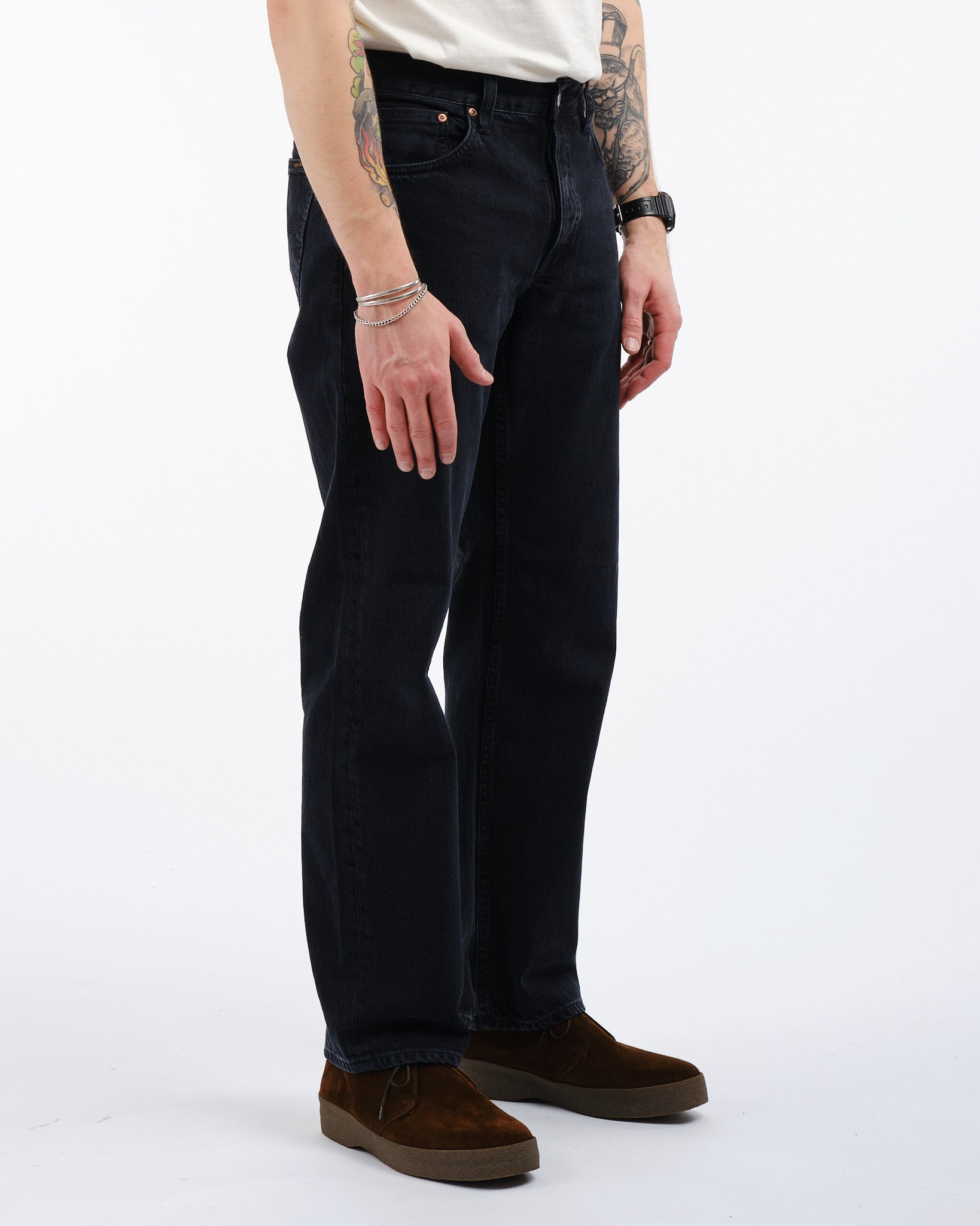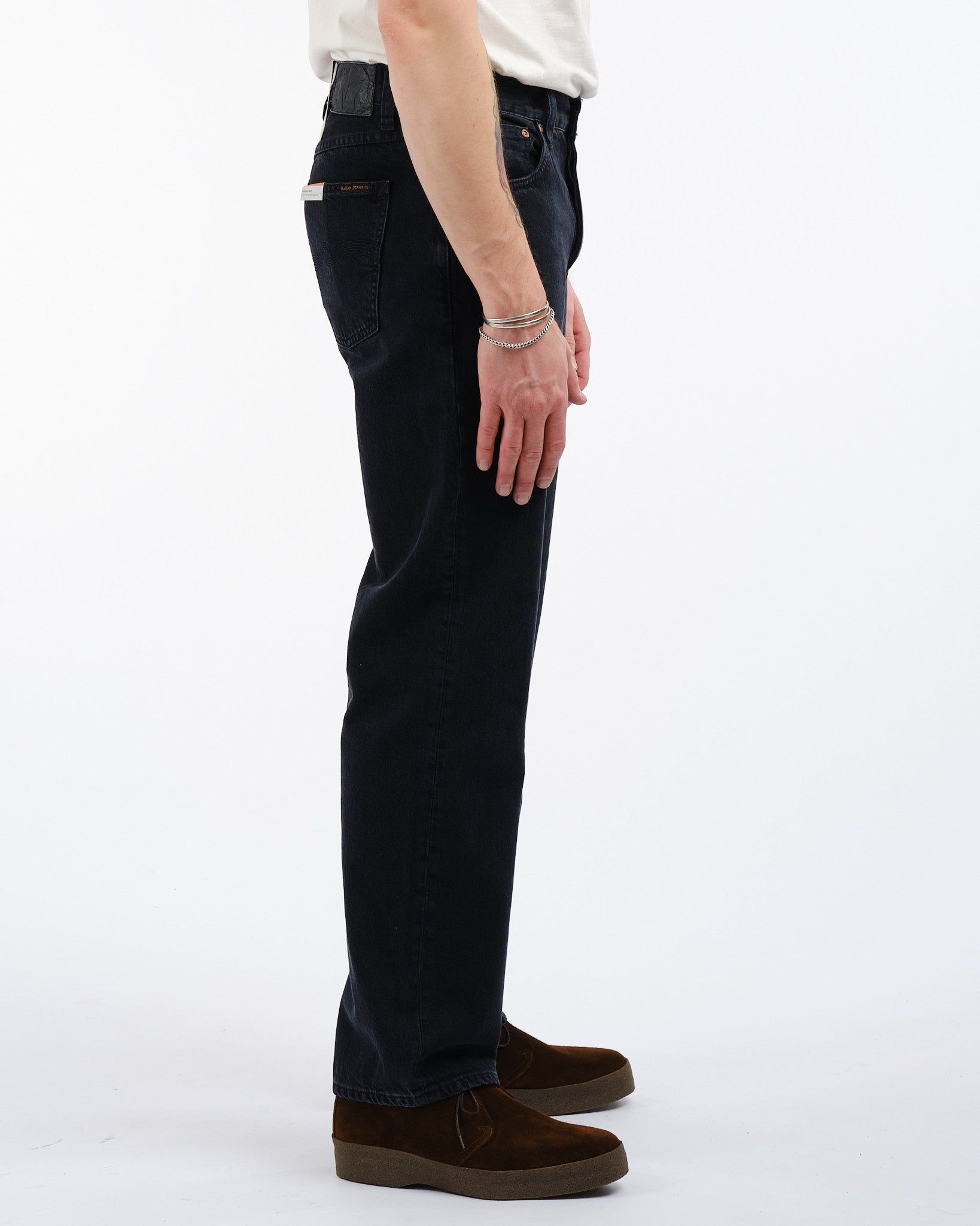 Rad Rufus Jeans Zwart Vintage van Nudie Jeans CO. Een nieuwe pasvorm van Nudie, de Rad Rufus gesneden uit een prachtige gewassen biologische katoenen denim. Normale pasvorm met een hoge taille, rechte pijp, normale beenopening en knoopsluiting. Gemaakt in Italië.
