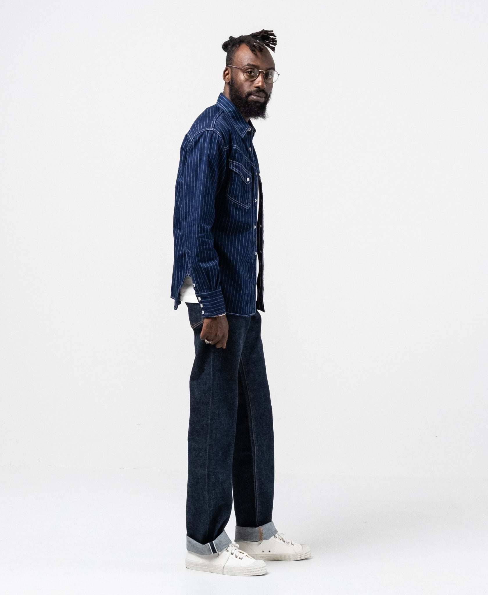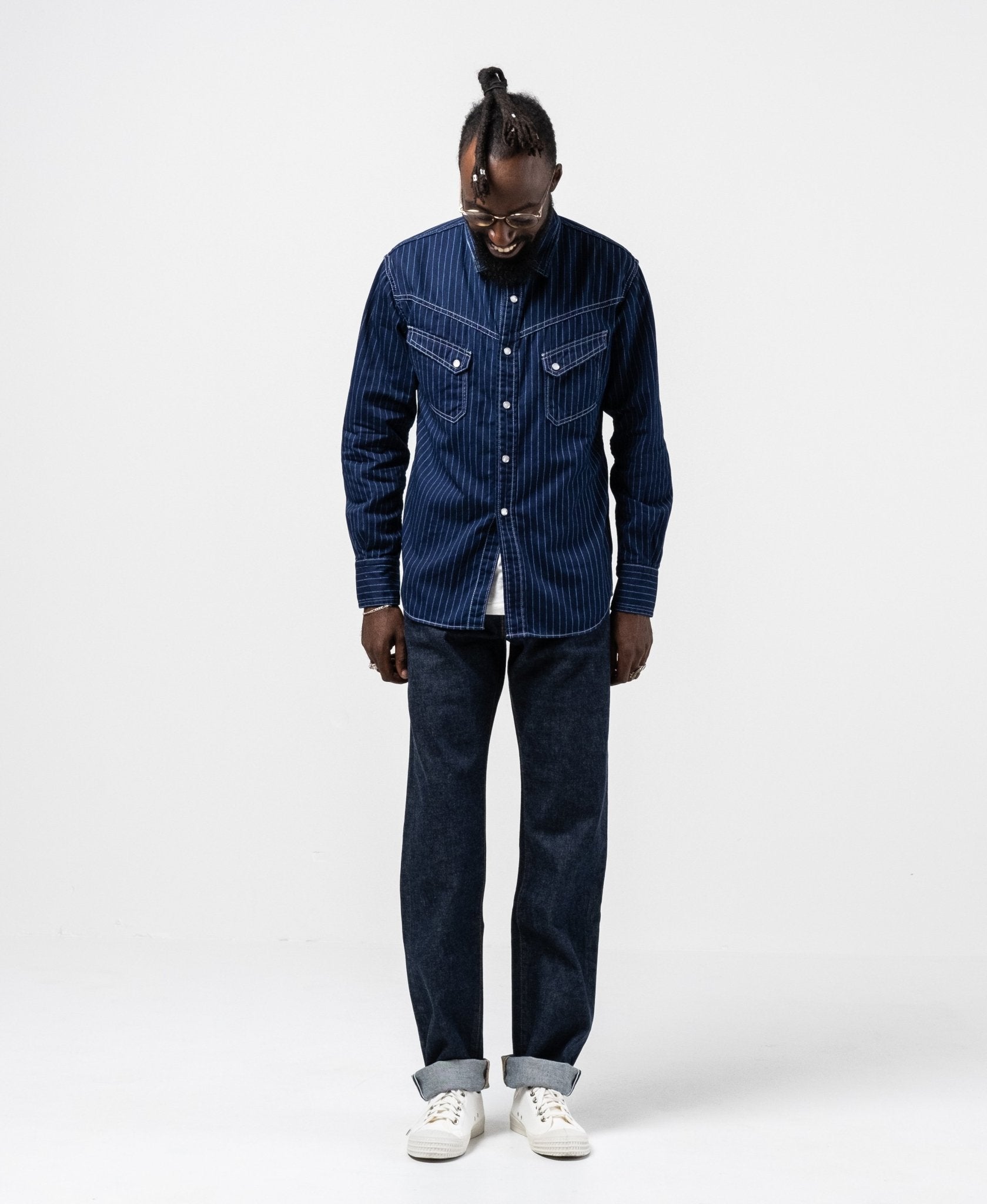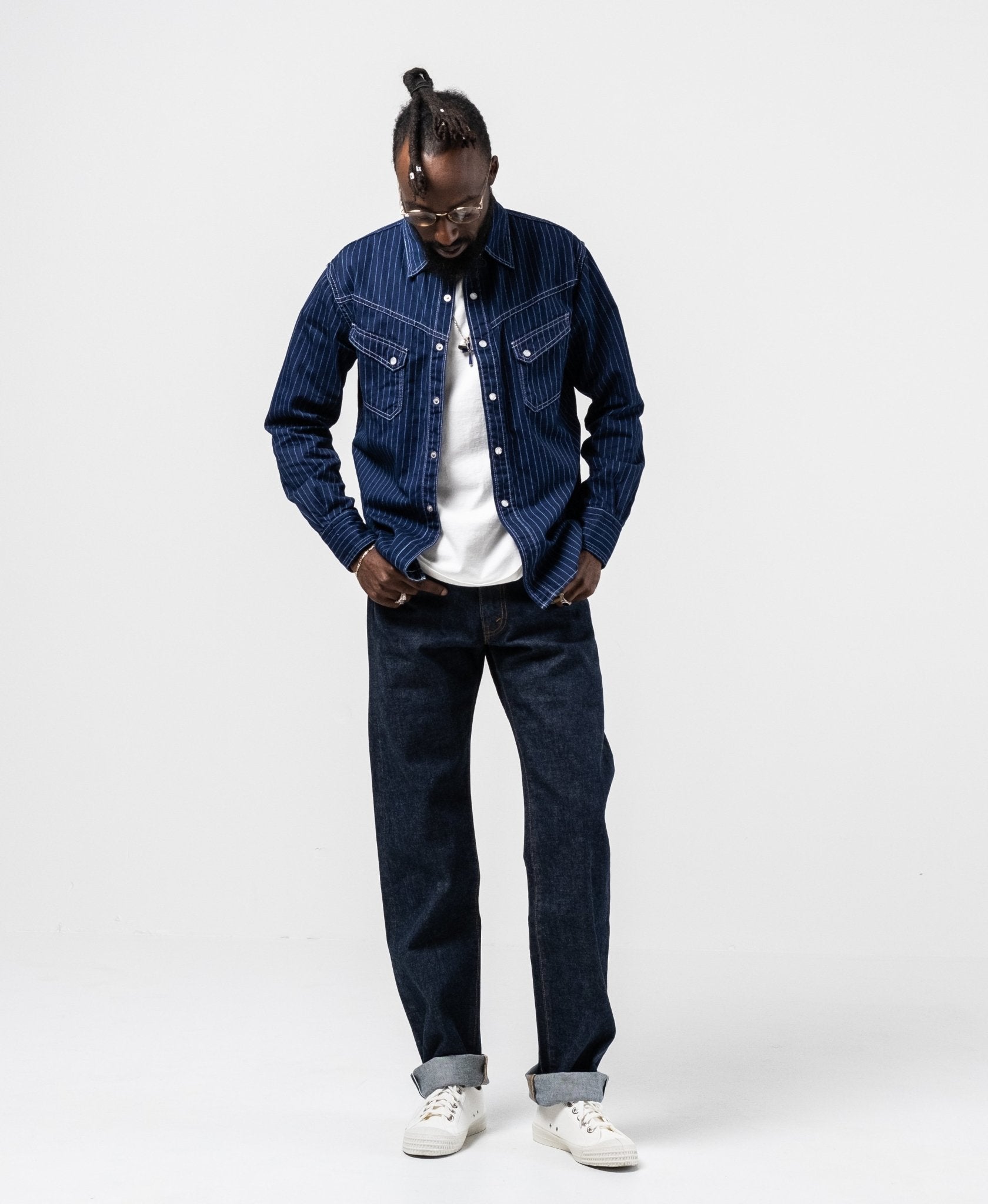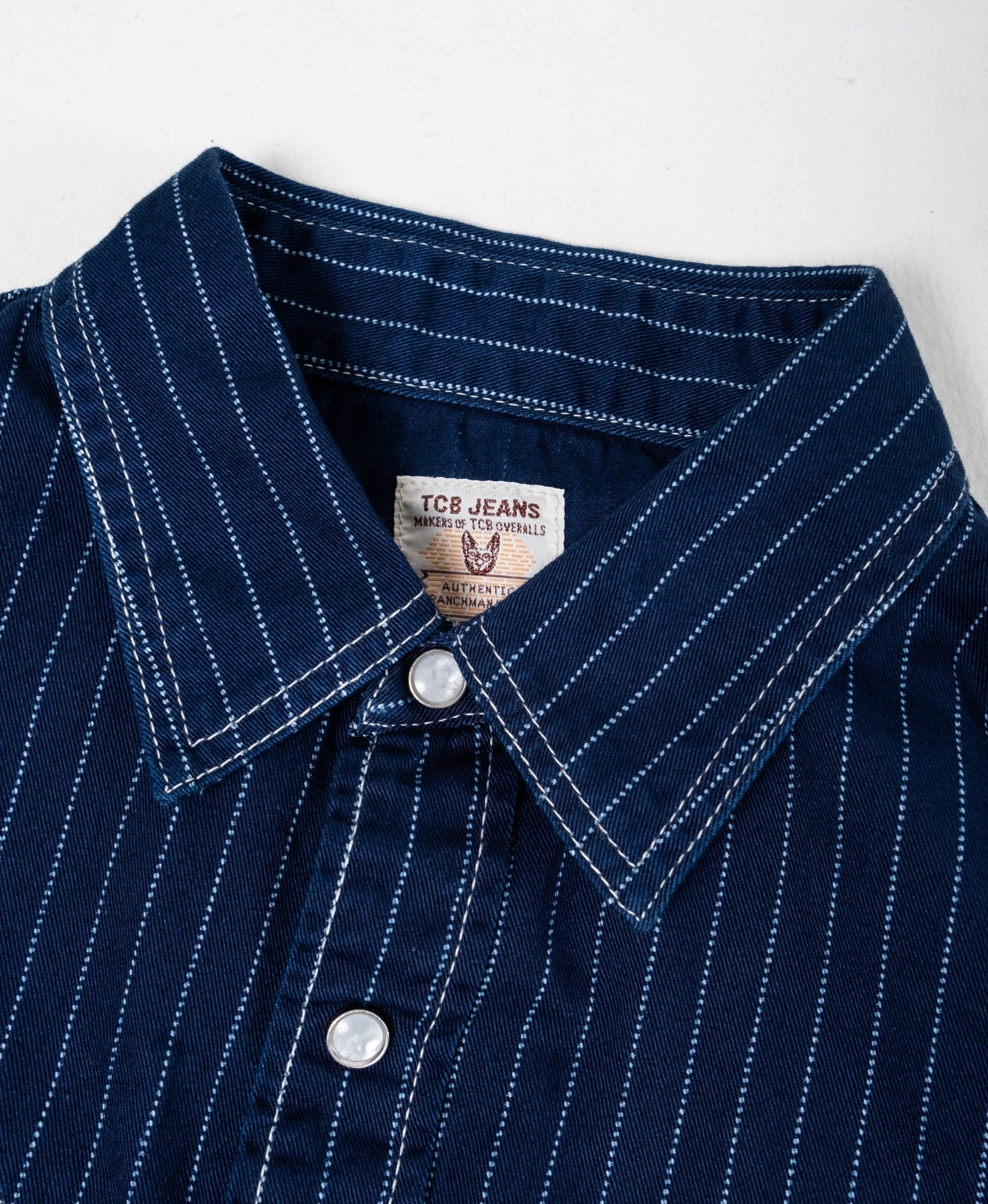 Ranchman Shirt Blue Wabash van TCB. Dit overhemd is geïnspireerd op de western overhemden uit de jaren '40. De details liggen zeer dicht bij het origineel, wat de silhouet iets strakker maakt dan de vintage versie, en dus makkelijk te combineren met elke stijl. Het denim is gemaakt van 8,5 oz Californisch katoen dat langzaam geweven is op een oude weefgetouw. Het is een iets lichter denim dat wat ongelijkheid heeft in de stof. Gemaakt in Japan.