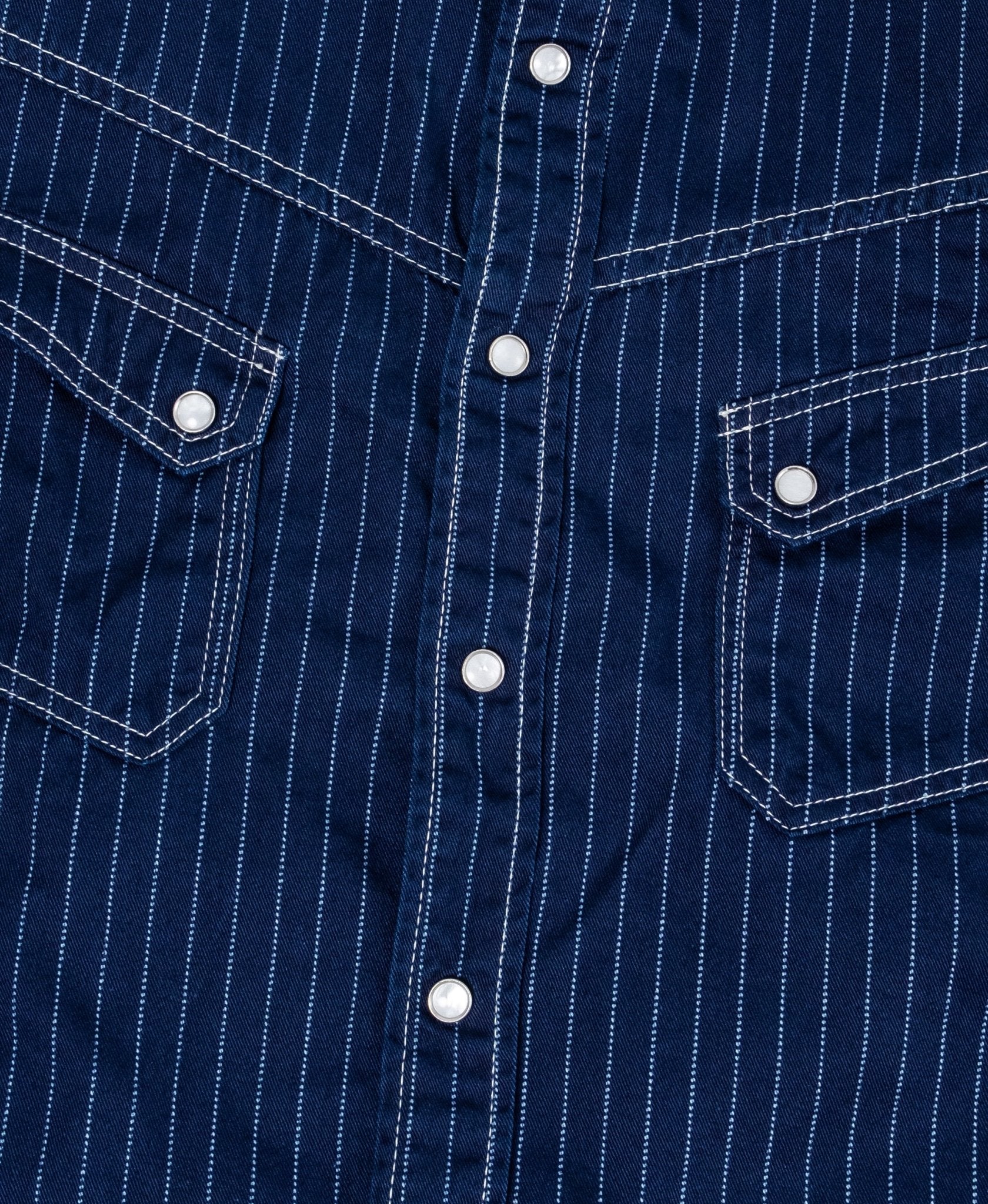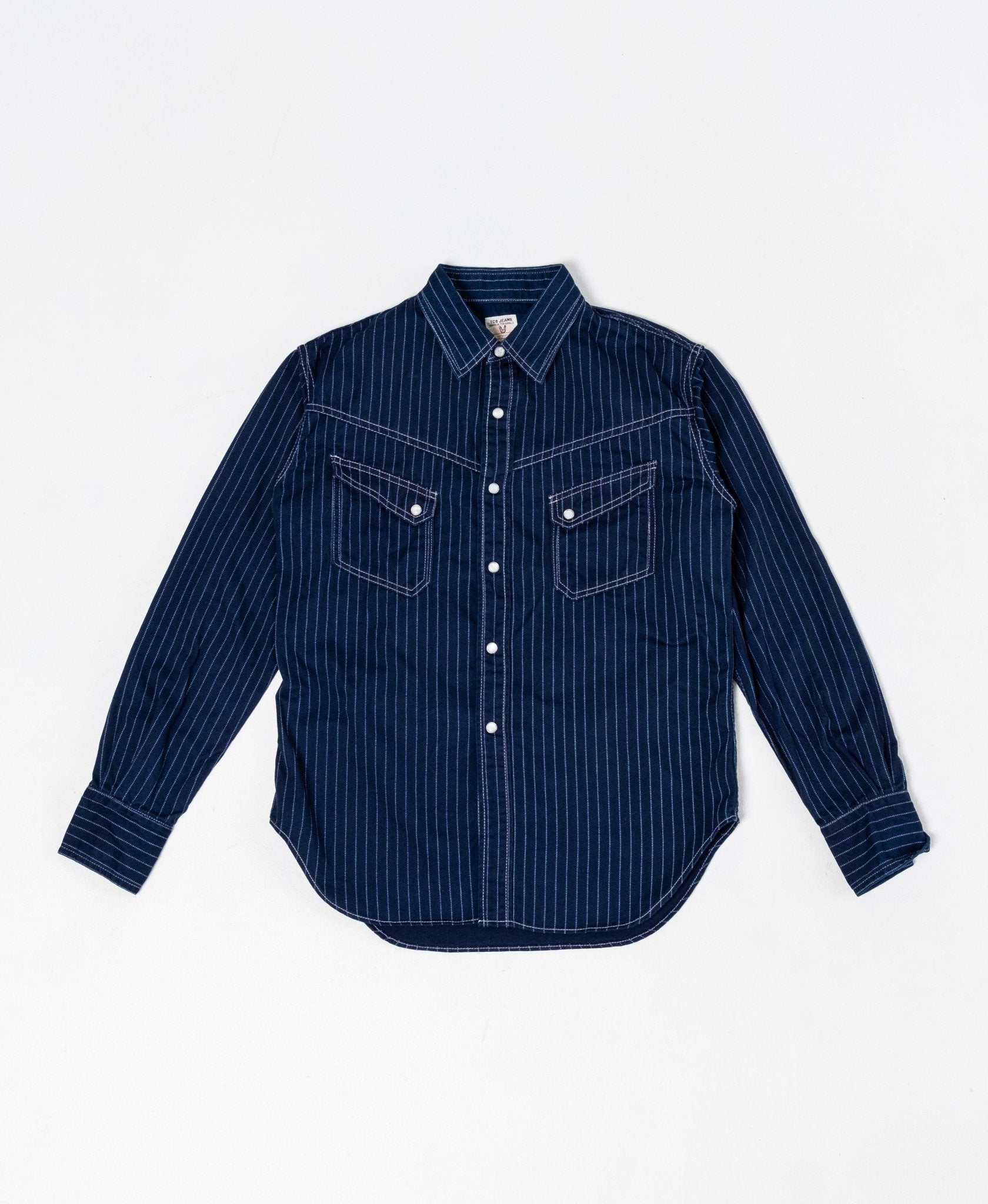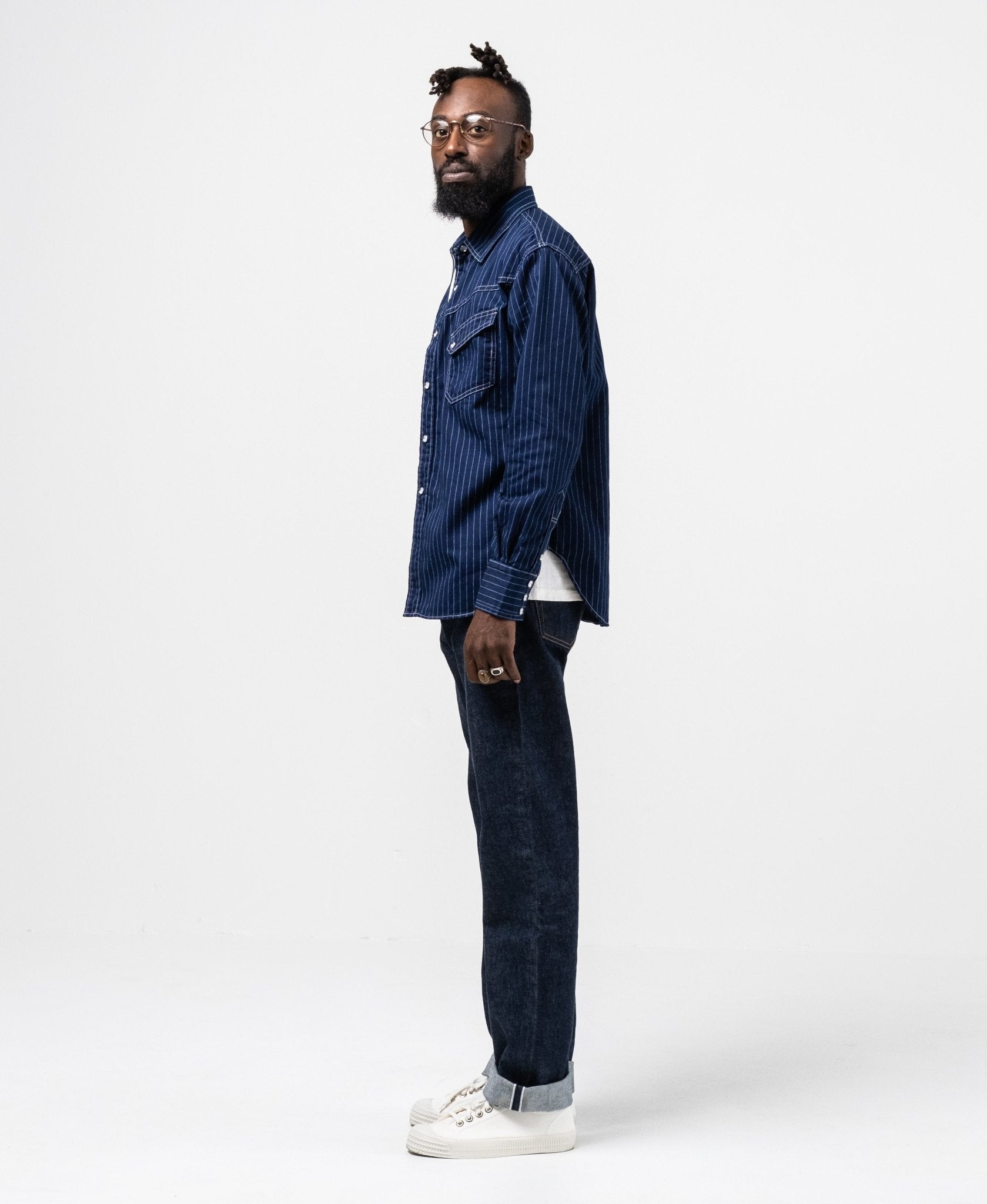 Ranchman Shirt Blue Wabash van TCB. Dit overhemd is geïnspireerd op de western overhemden uit de jaren '40. De details liggen zeer dicht bij het origineel, wat de silhouet iets strakker maakt dan de vintage versie, en dus makkelijk te combineren met elke stijl. Het denim is gemaakt van 8,5 oz Californisch katoen dat langzaam geweven is op een oude weefgetouw. Het is een iets lichter denim dat wat ongelijkheid heeft in de stof. Gemaakt in Japan.