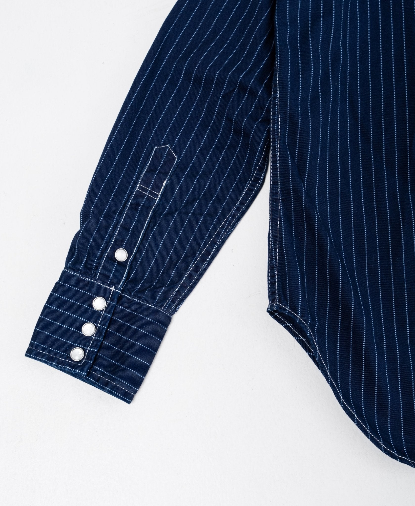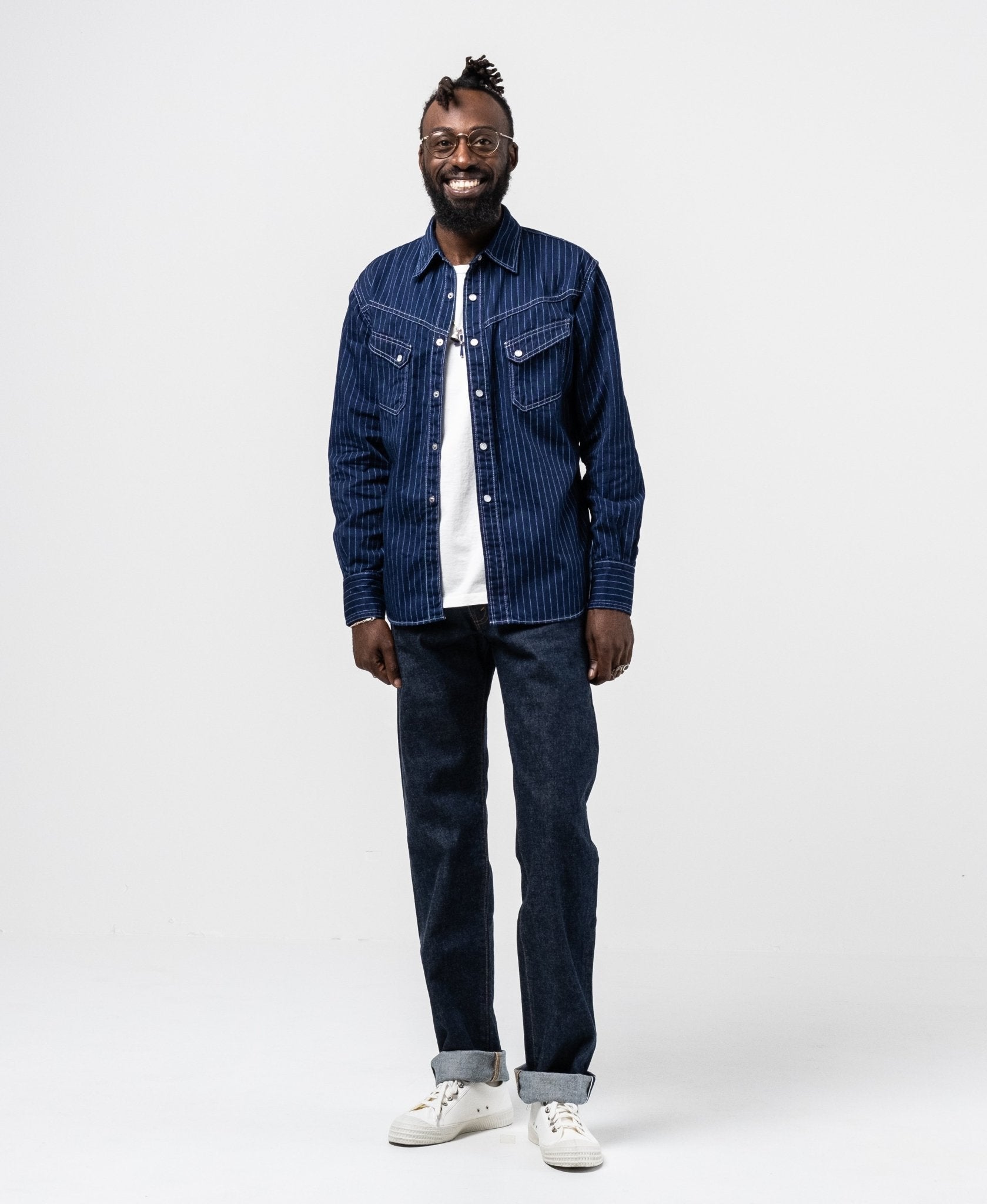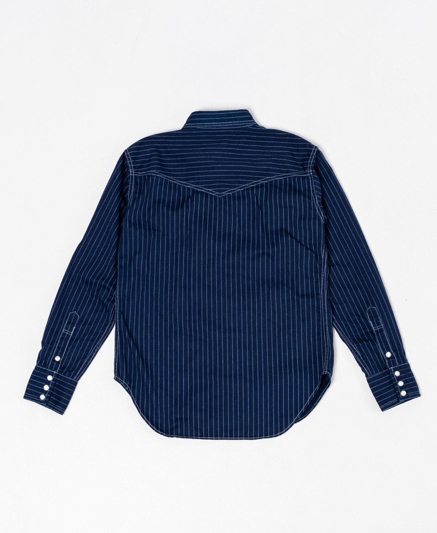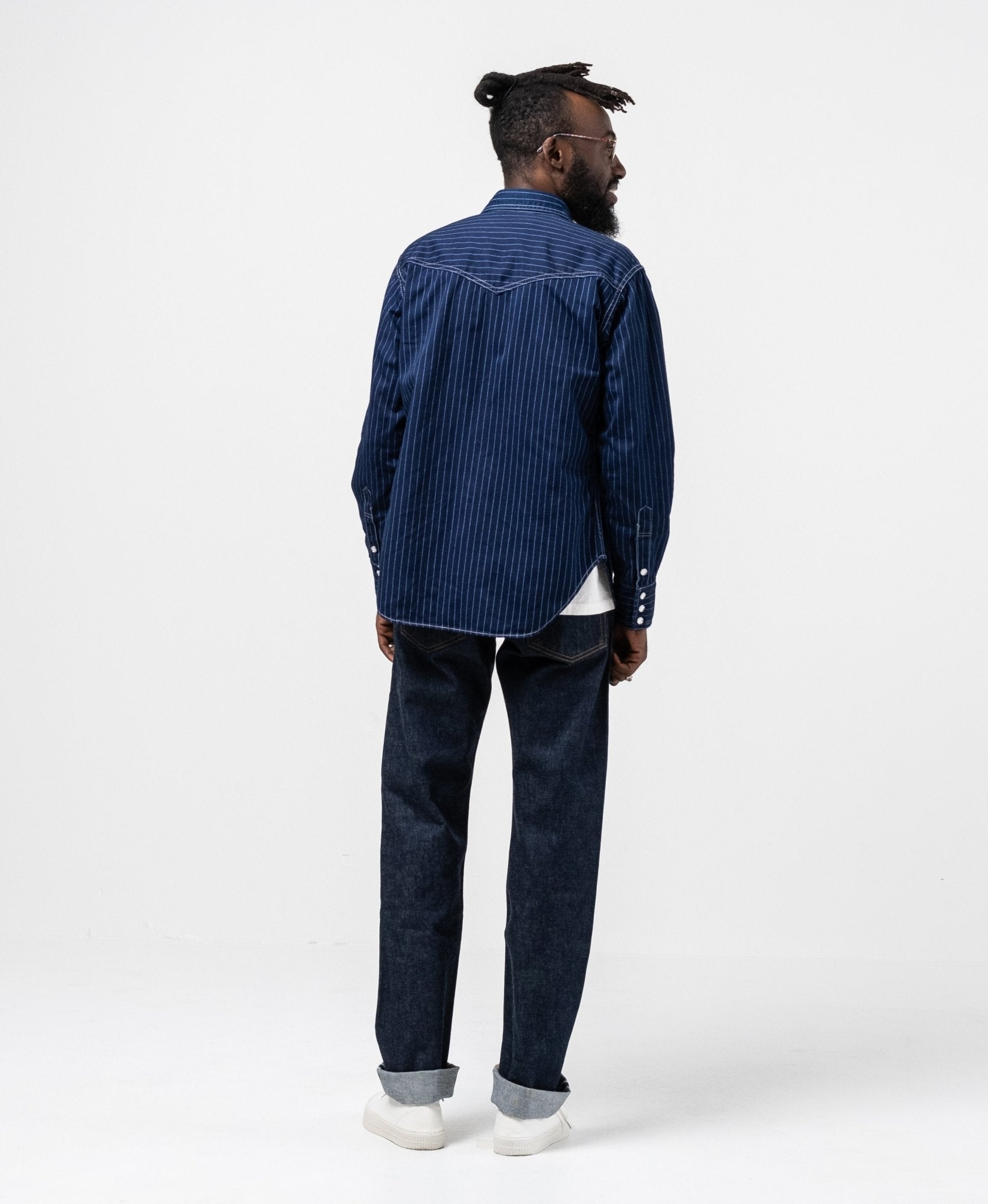 Ranchman Shirt Blue Wabash van TCB. Dit overhemd is geïnspireerd op de western overhemden uit de jaren '40. De details liggen zeer dicht bij het origineel, wat de silhouet iets strakker maakt dan de vintage versie, en dus makkelijk te combineren met elke stijl. Het denim is gemaakt van 8,5 oz Californisch katoen dat langzaam geweven is op een oude weefgetouw. Het is een iets lichter denim dat wat ongelijkheid heeft in de stof. Gemaakt in Japan.