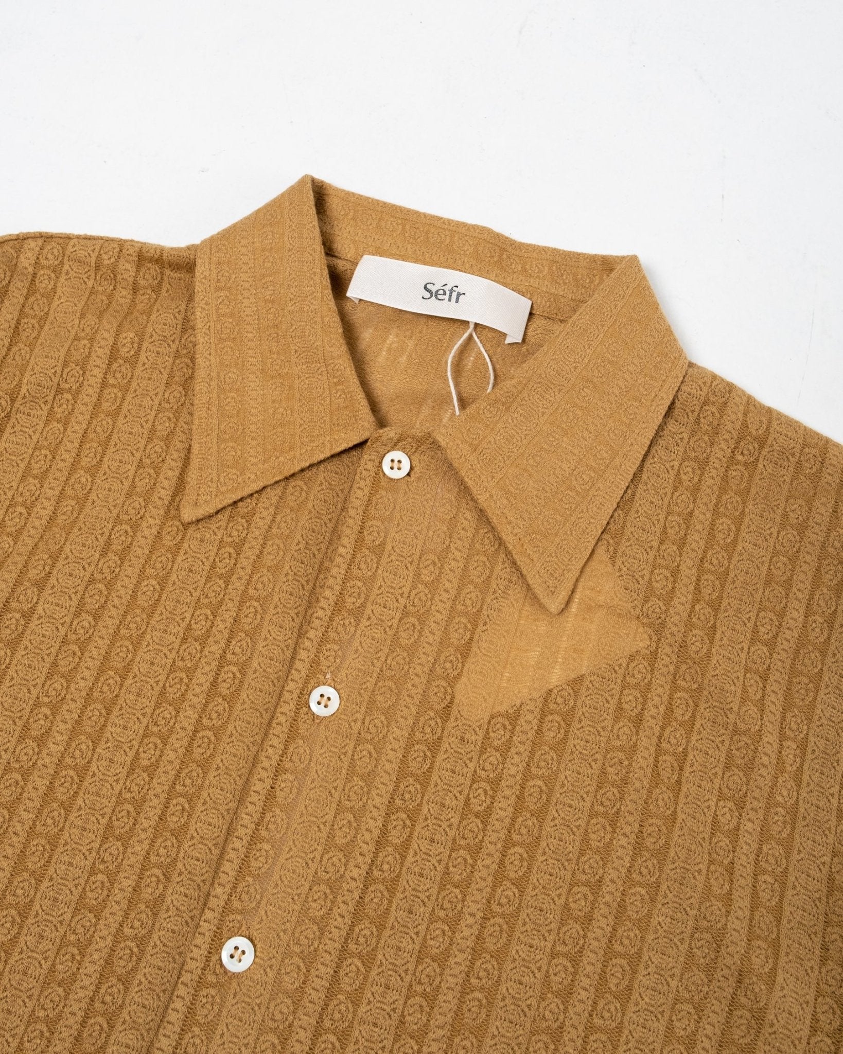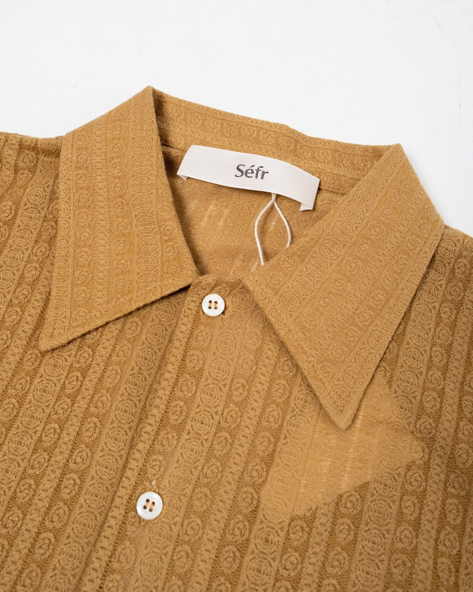 Ripley Shirt Medallion Yellow van Séfr. Overhemd met lange mouwen, brede kraag en parelmoeren knopen. Recht model met Franse sluiting en rechte zoom. 87% biologisch katoen en 13% polyester. Gemaakt in Letland.