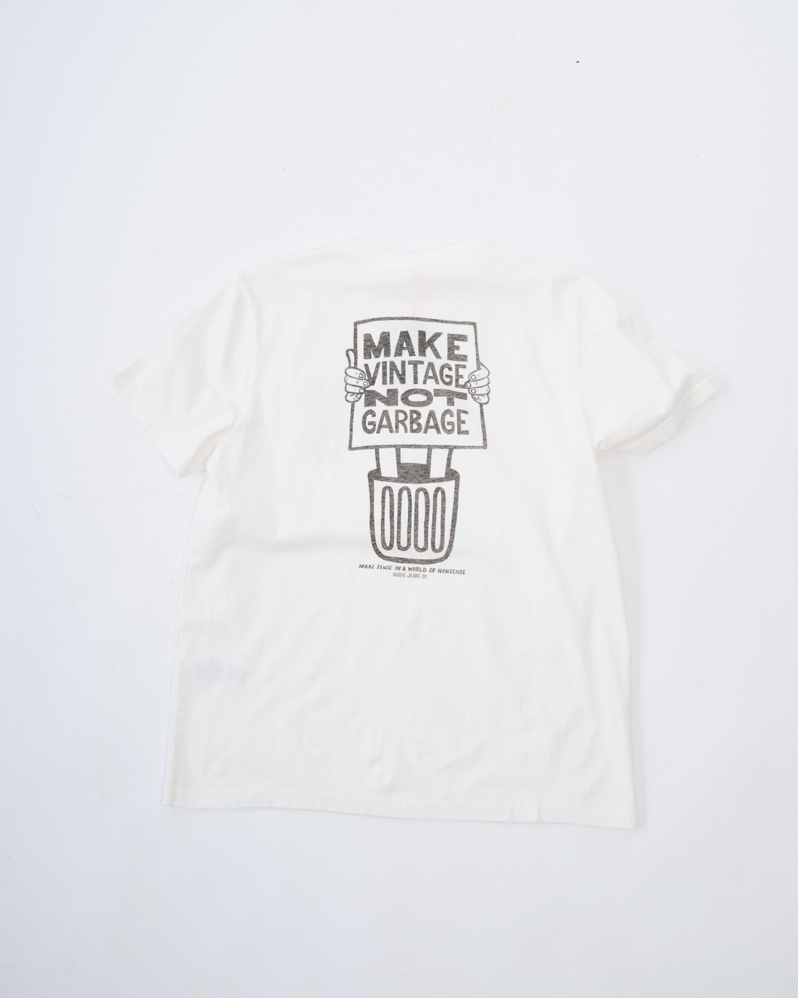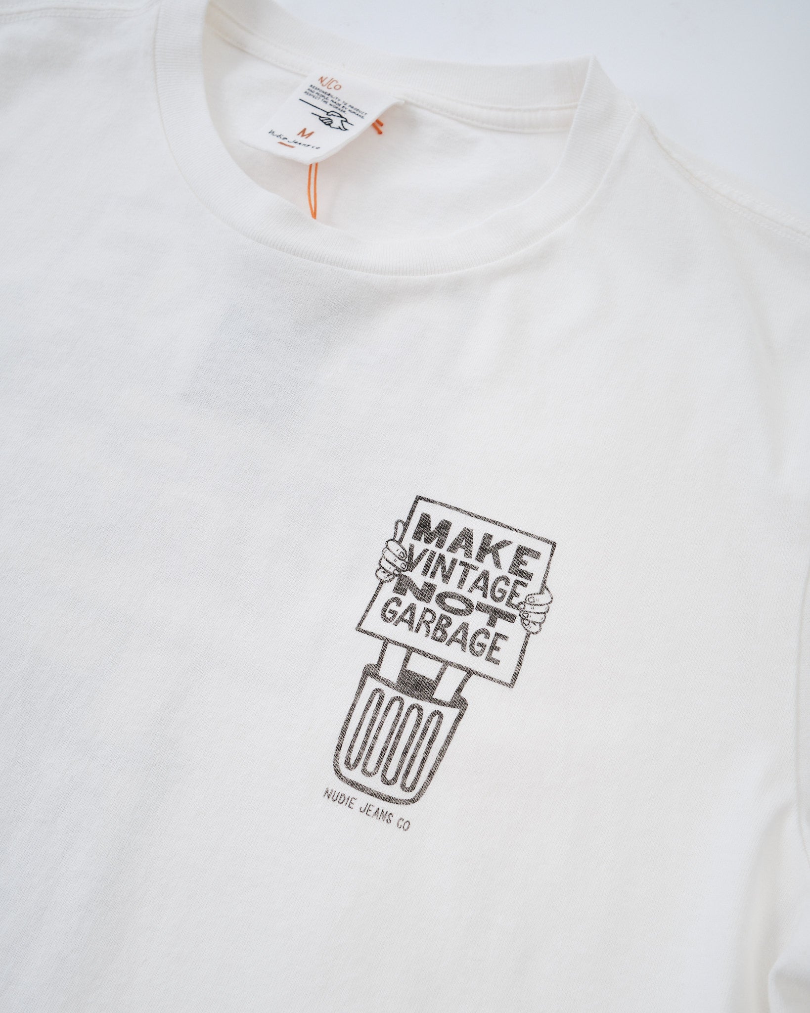 De NUDIE JEANS CO. ROY GARBAGE T-SHIRT KRIJT WIT is een op vintage geïnspireerd T-shirt met ronde hals ontworpen voor een natuurlijk ingedragen uiterlijk. Gemaakt van 100% biologisch katoen, het bevat open-end gesponnen garen, wat zorgt voor een open-gebreide structuur met een onregelmatige textuur, een droog handgevoel en subtiele harigheid.