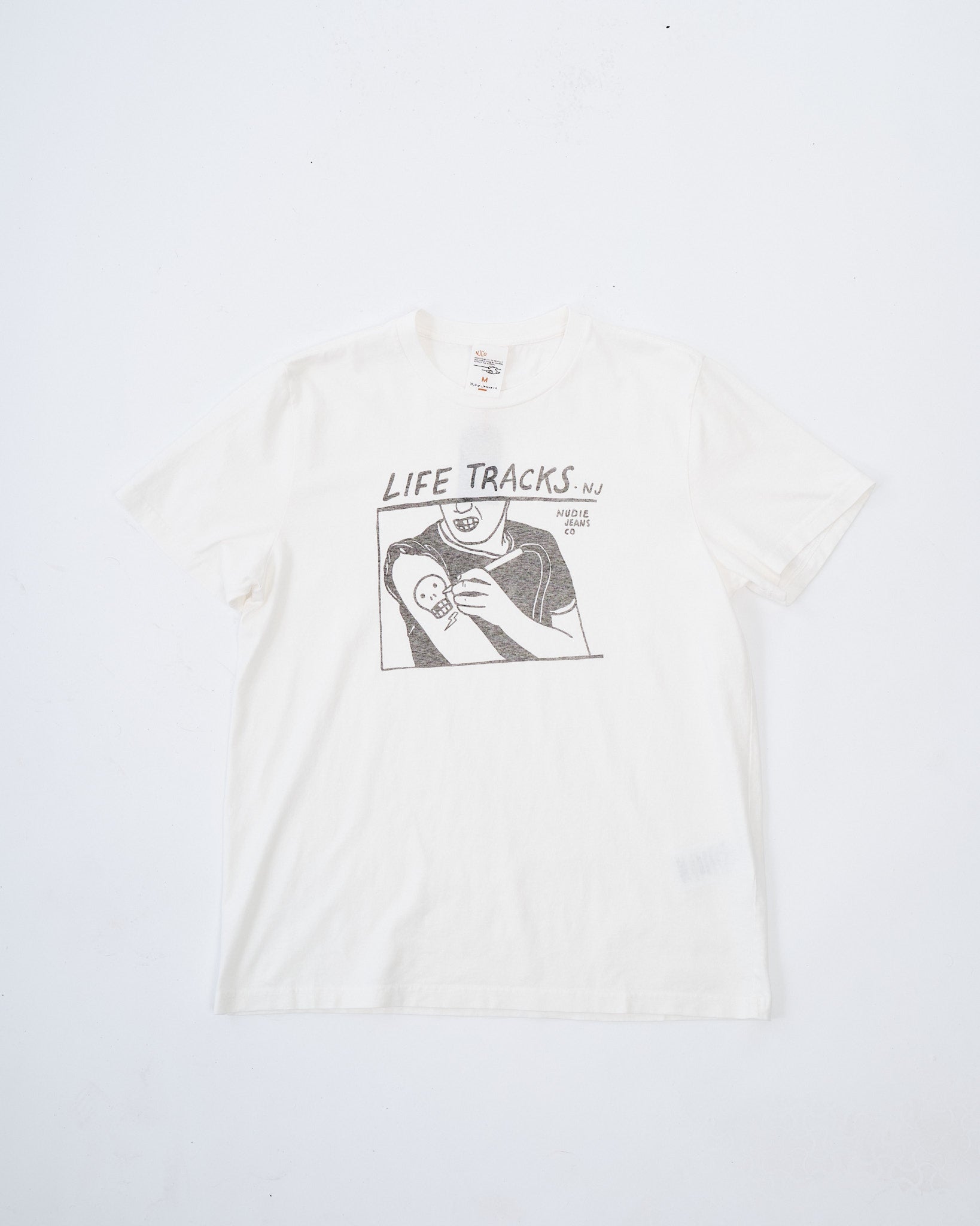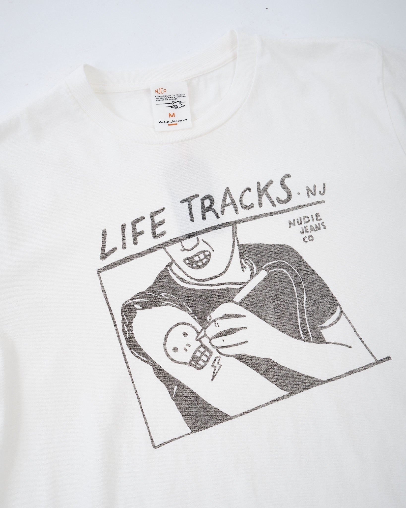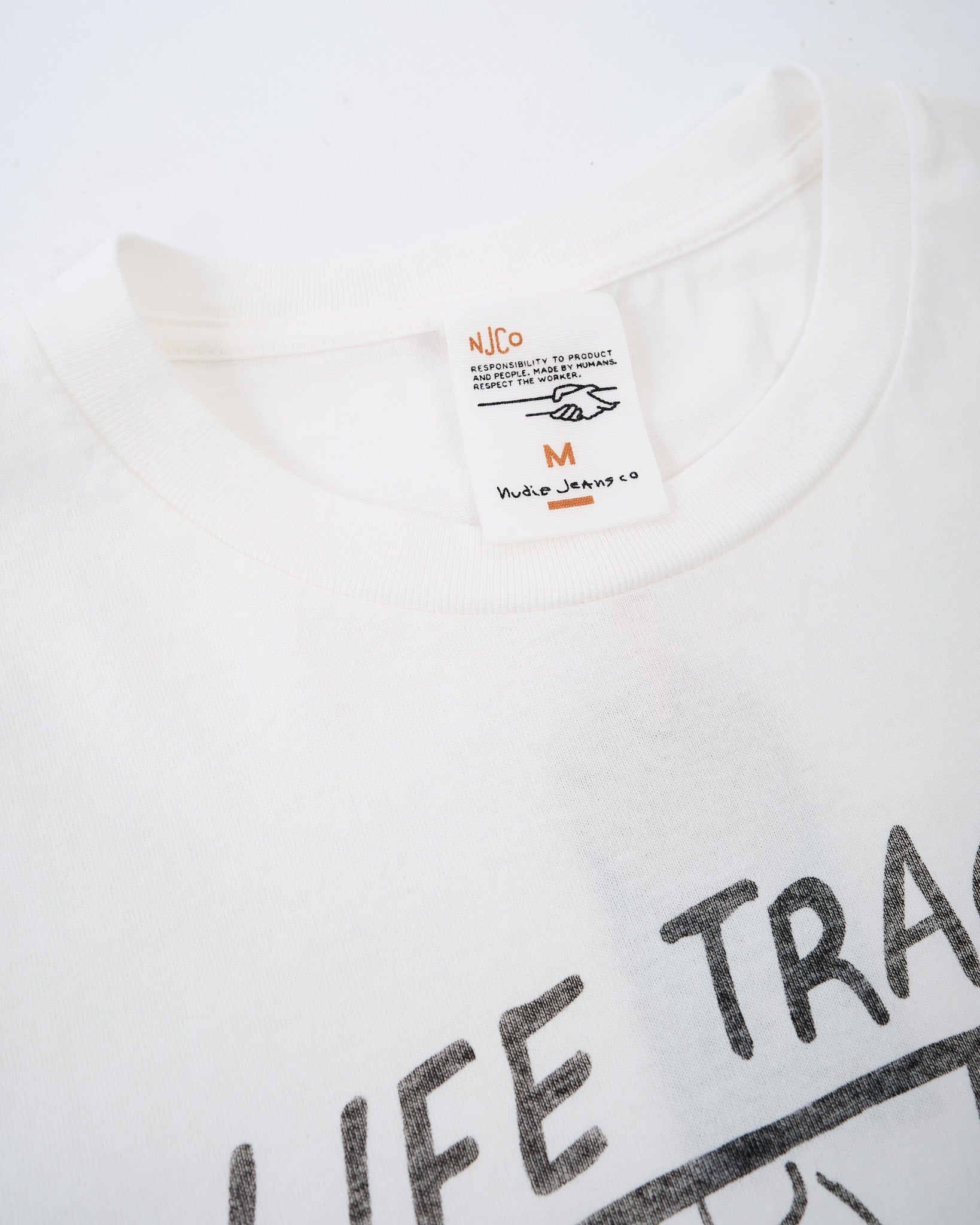De NUDIE JEANS CO. ROY LIFE TRACKS T-SHIRT CHALK WHITE is een klassieke crew neck tee ontworpen voor een ontspannen, vintage-geïnspireerde look. Gemaakt van 100% biologisch katoen, het bevat open-end gesponnen garen, wat resulteert in een open-gebreide structuur met een onregelmatige textuur, een droog handgevoel en subtiele harigheid.