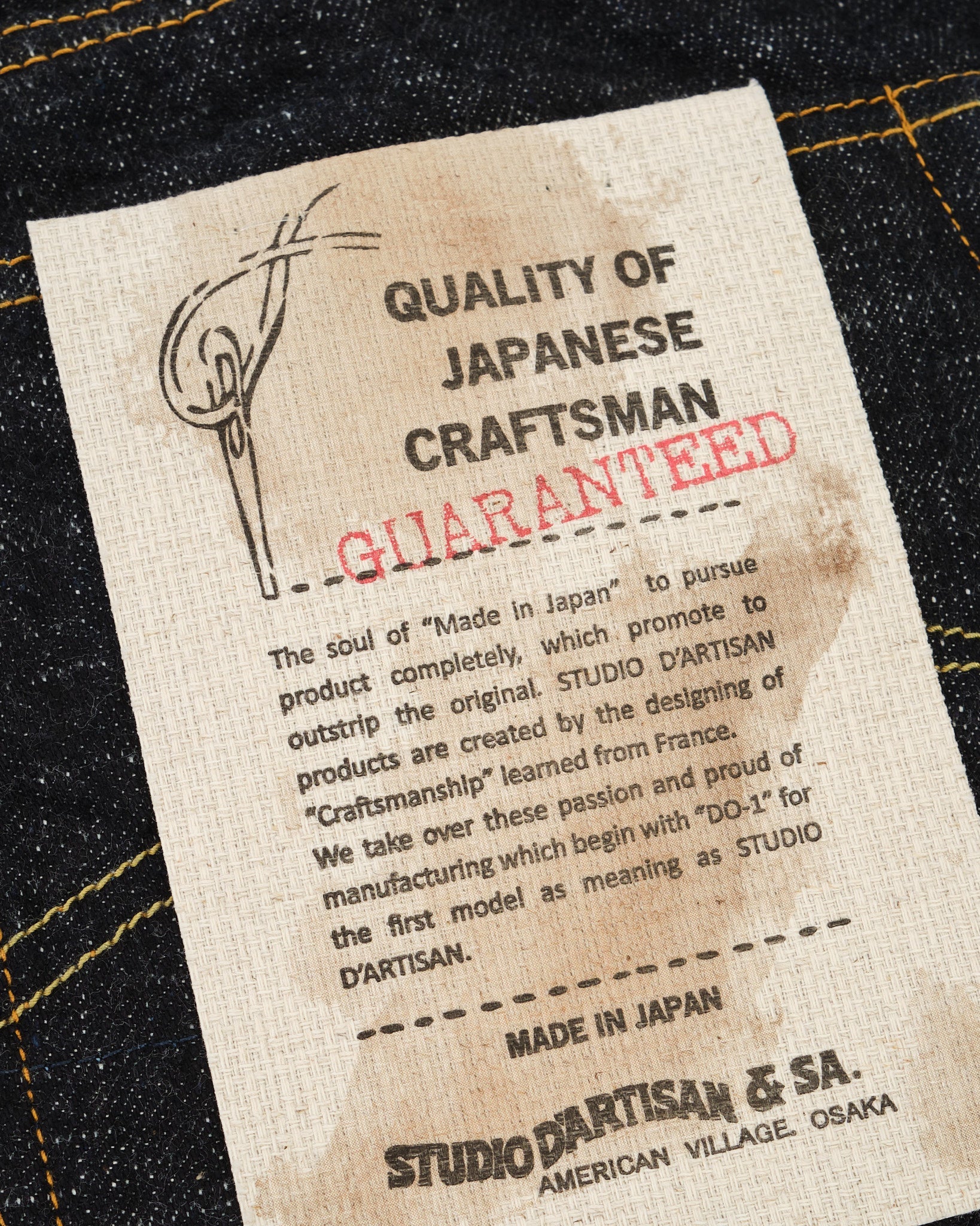 Elk aspect van de denim—garennummer, onregelmatige textuur, diepte van het touwverven en weefdichtheid—is zorgvuldig verfijnd met behulp van D'Artisan's eigen technieken. Dit proces zorgt voor een stof met rijk karakter, diepte en natuurlijke variaties, herinnerend aan klassieke werkkleding van vorige generaties.