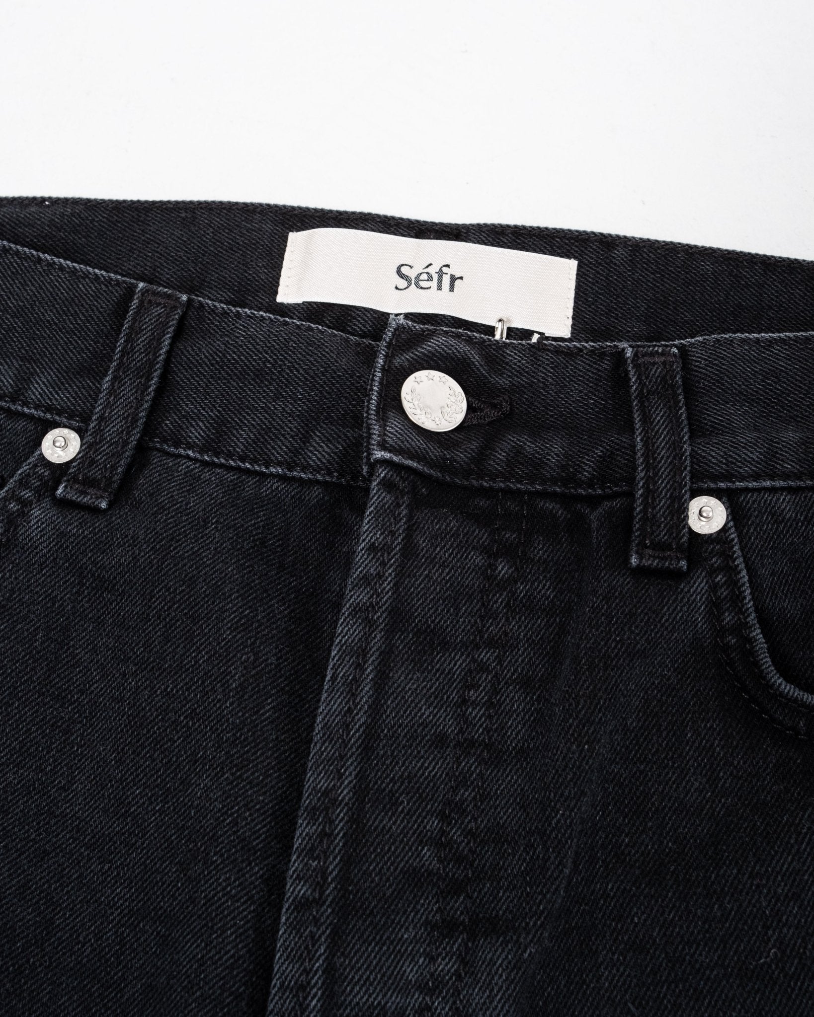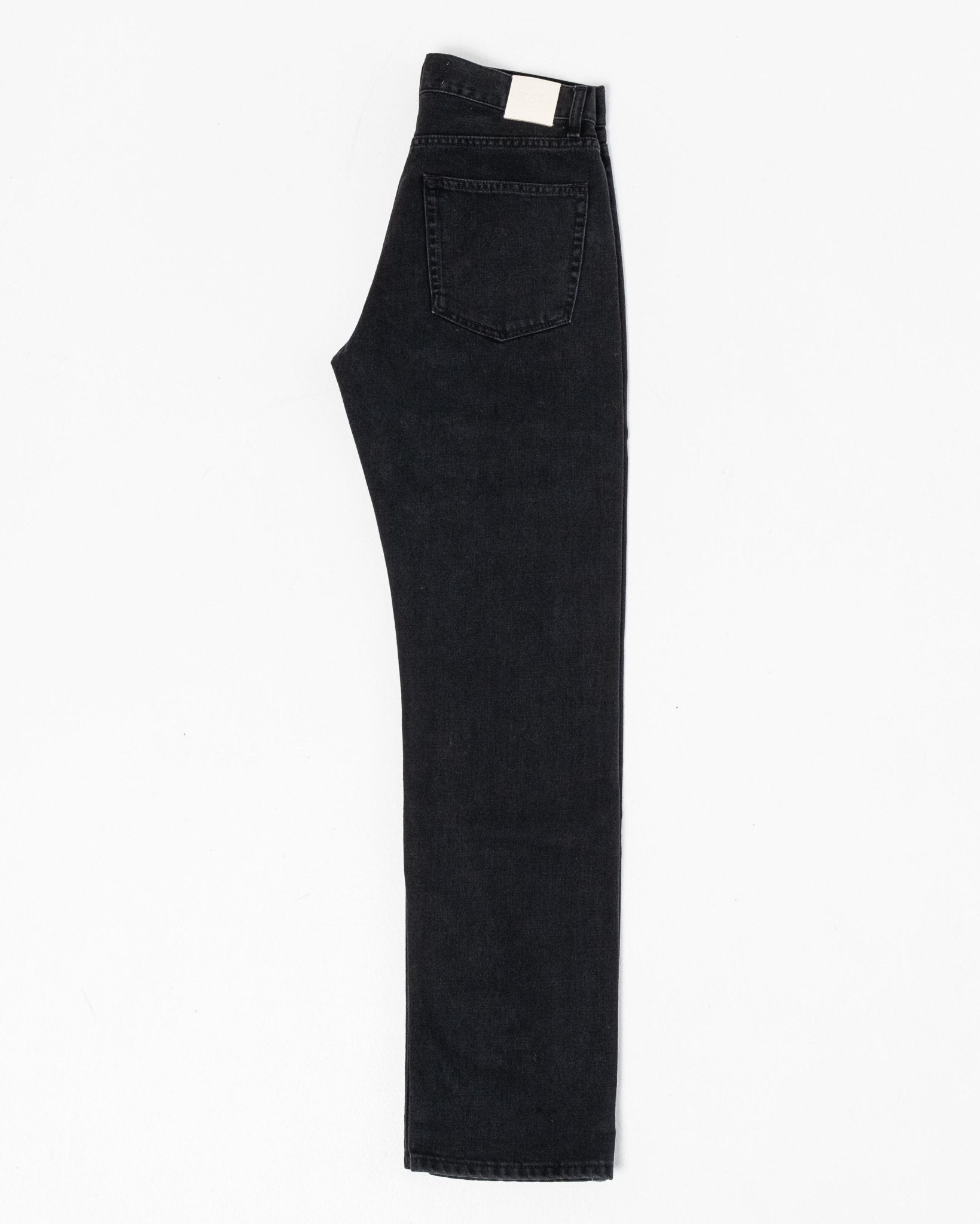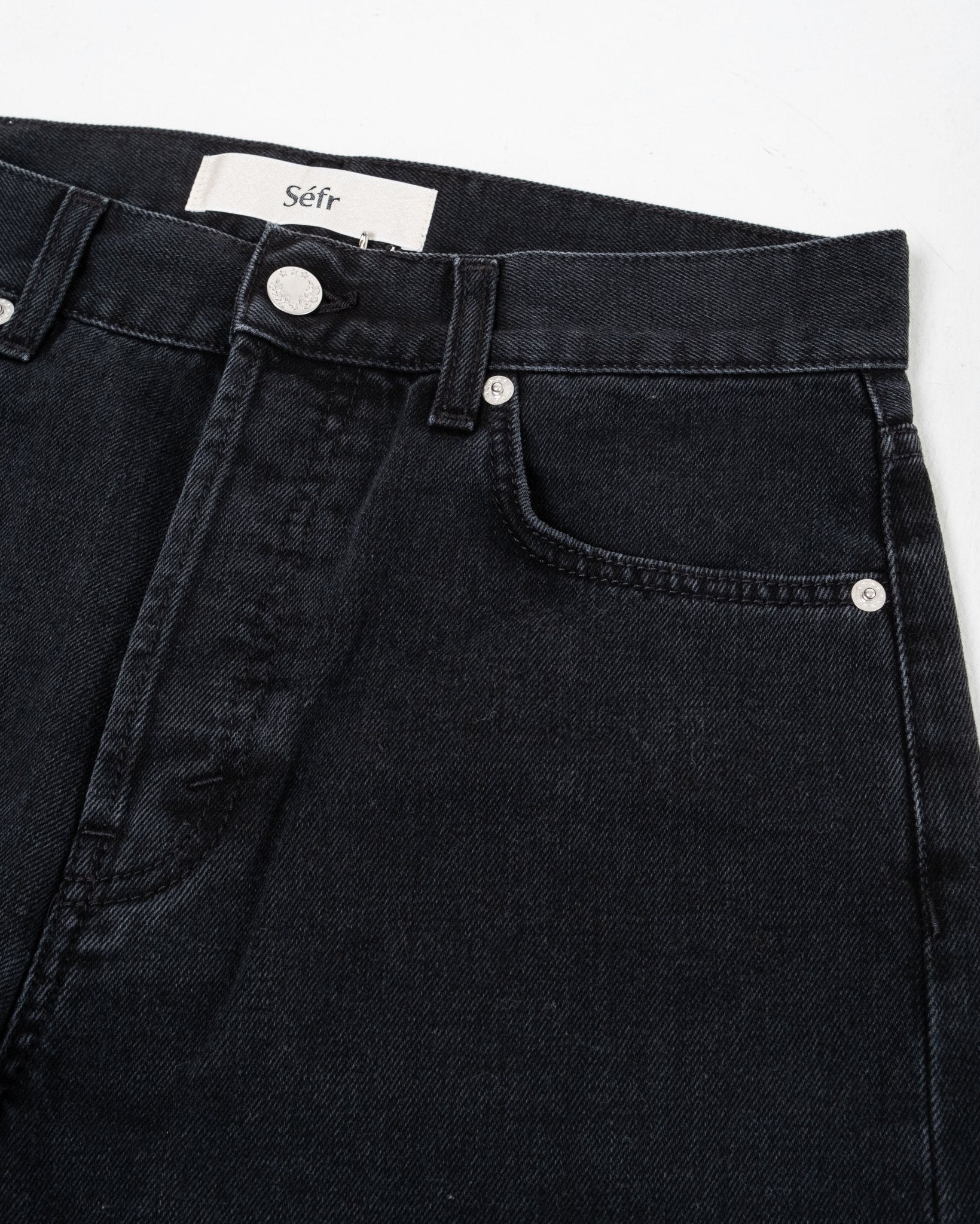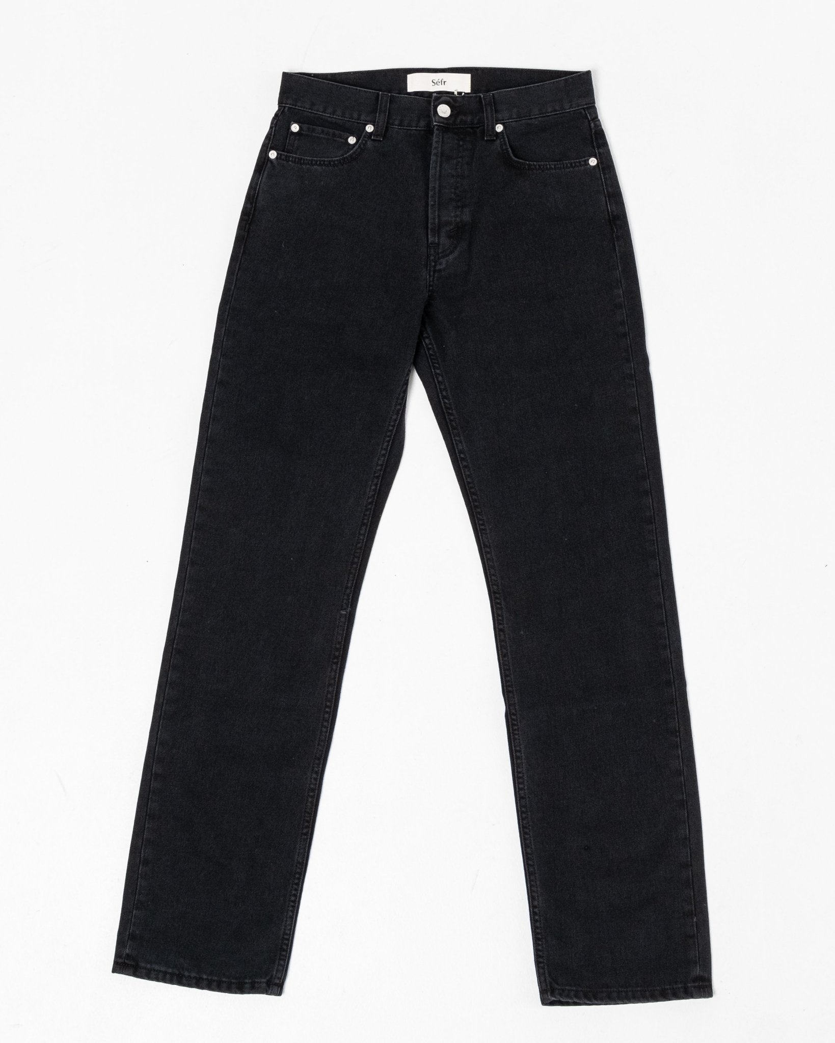 Straight Cut Jeans Rinsed Black van Séfr. Klassieke vijfzaksjeans gemaakt van 13 oz Italiaans katoen. Knoopsluiting voor, rechte snit en eenmaal gespoeld voor een zachte en comfortabele pasvorm vanaf het begin. Gemaakt in Letland.
