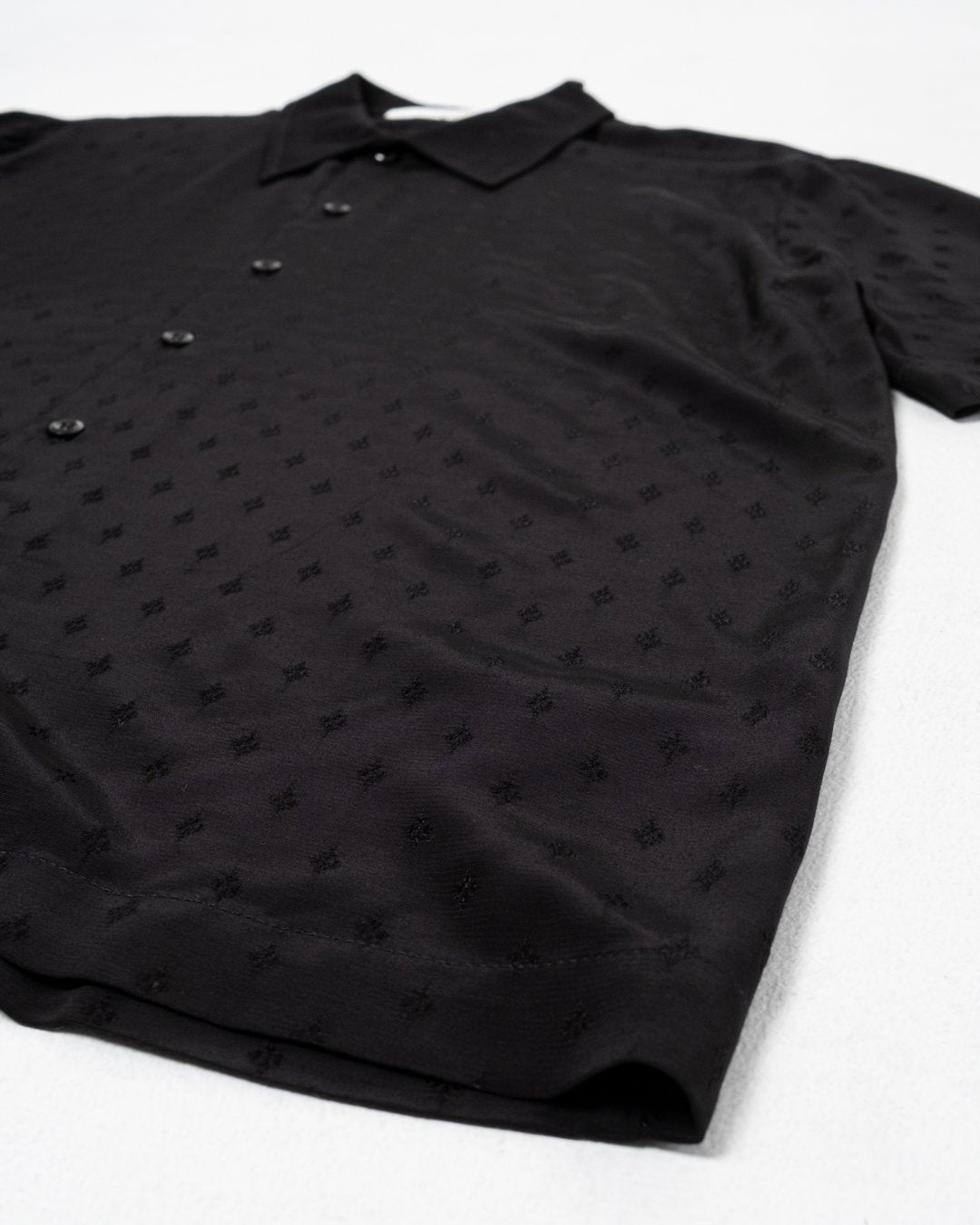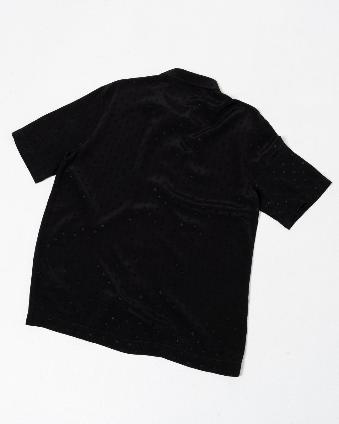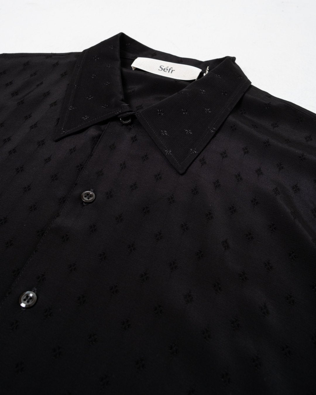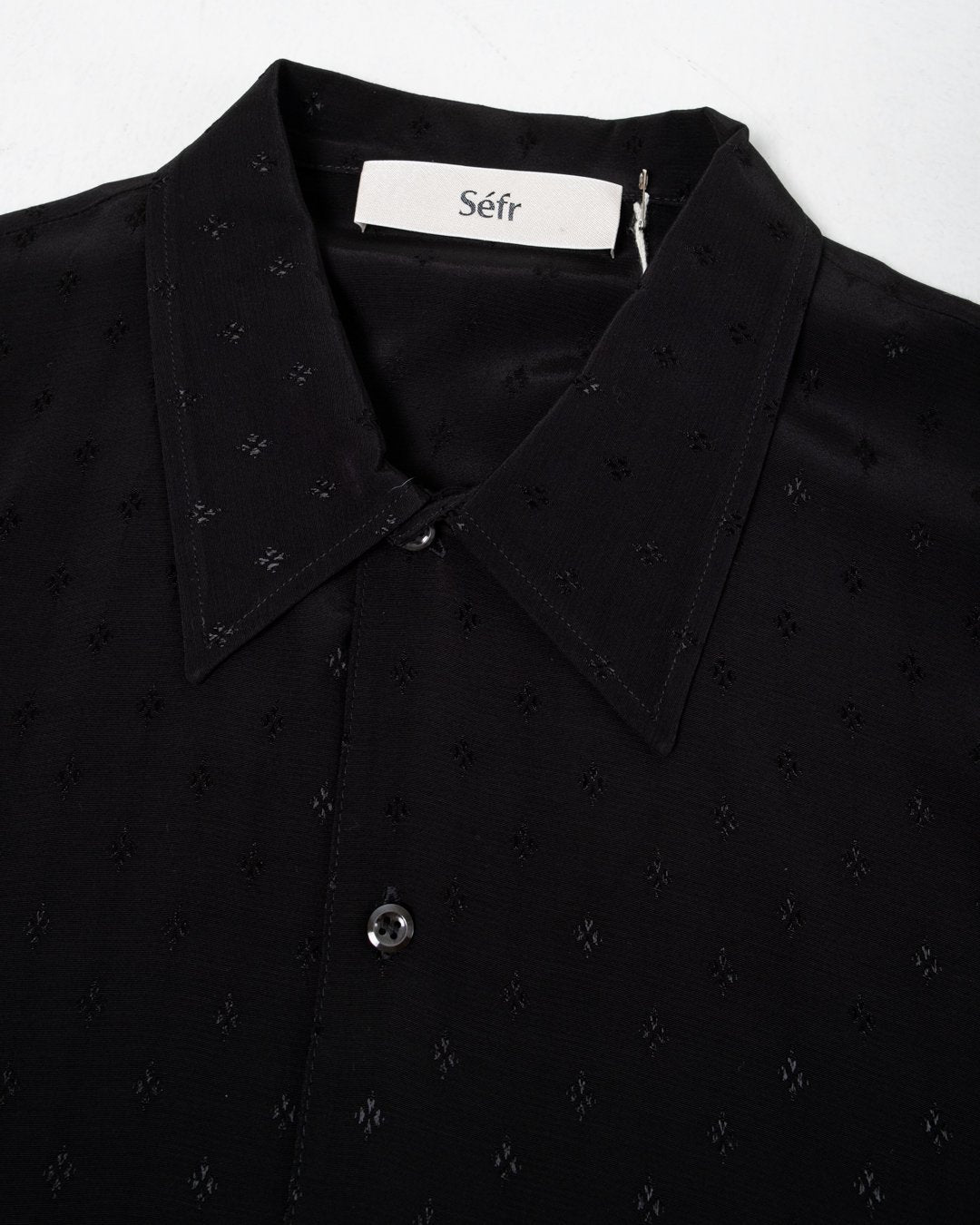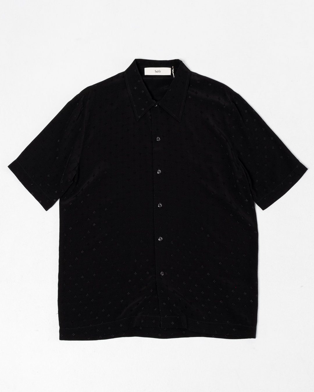 Suneham Shirt Black Print van Séfr. Korte mouwen shirt met een ontspannen pasvorm en brede kraag. Moeder van parel knopen uit Italië, en de stof in 100% viscose. Gemaakt in Letland.