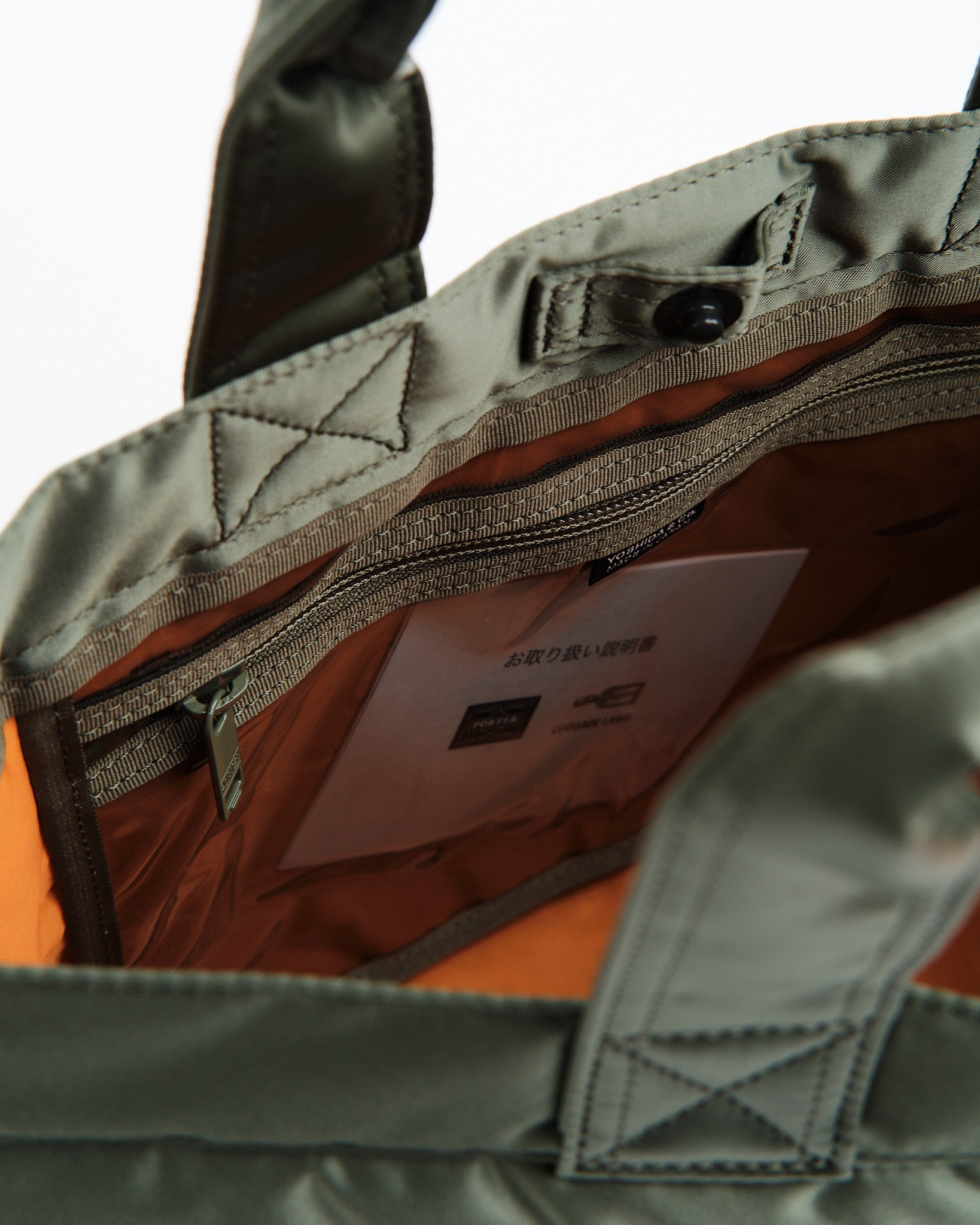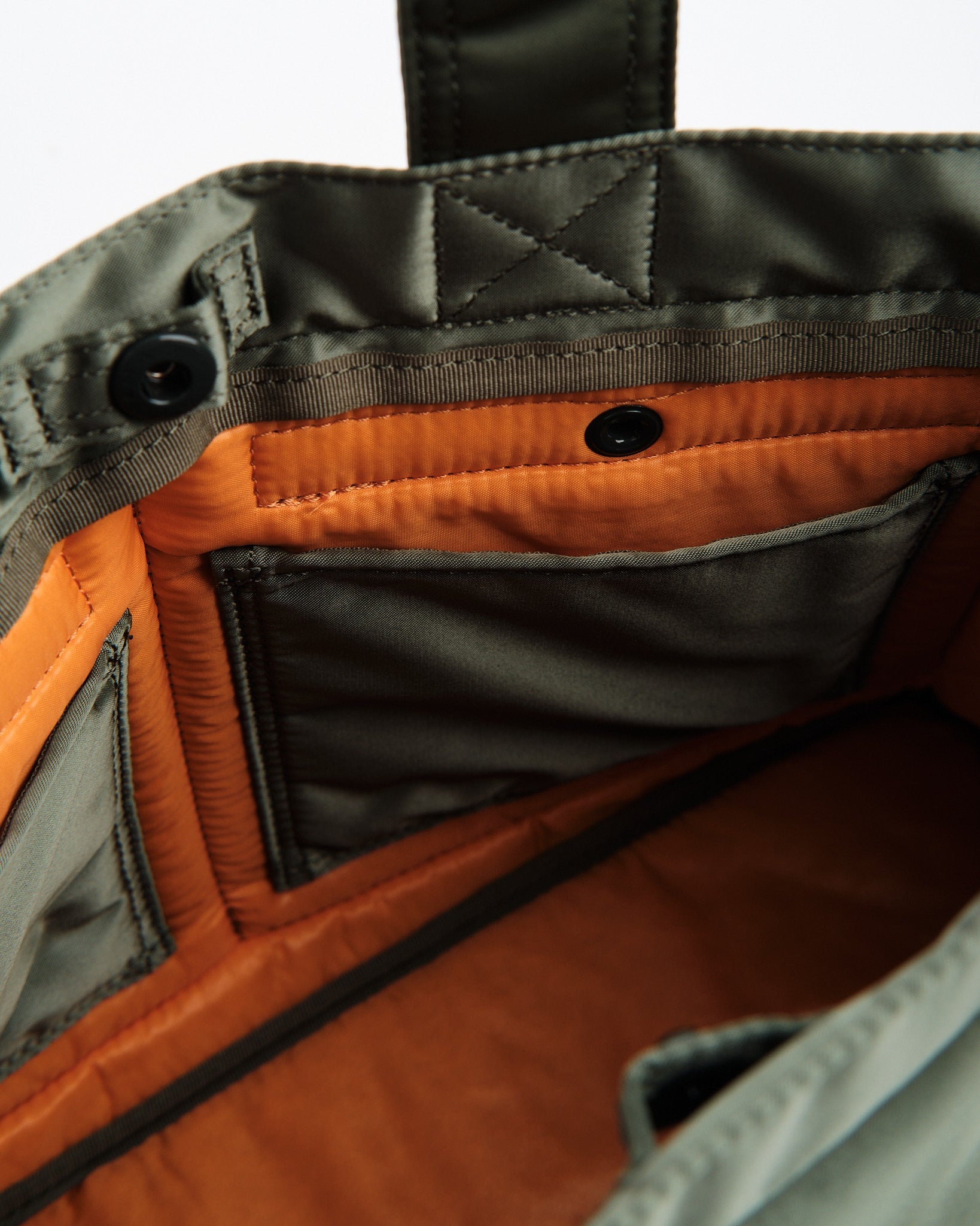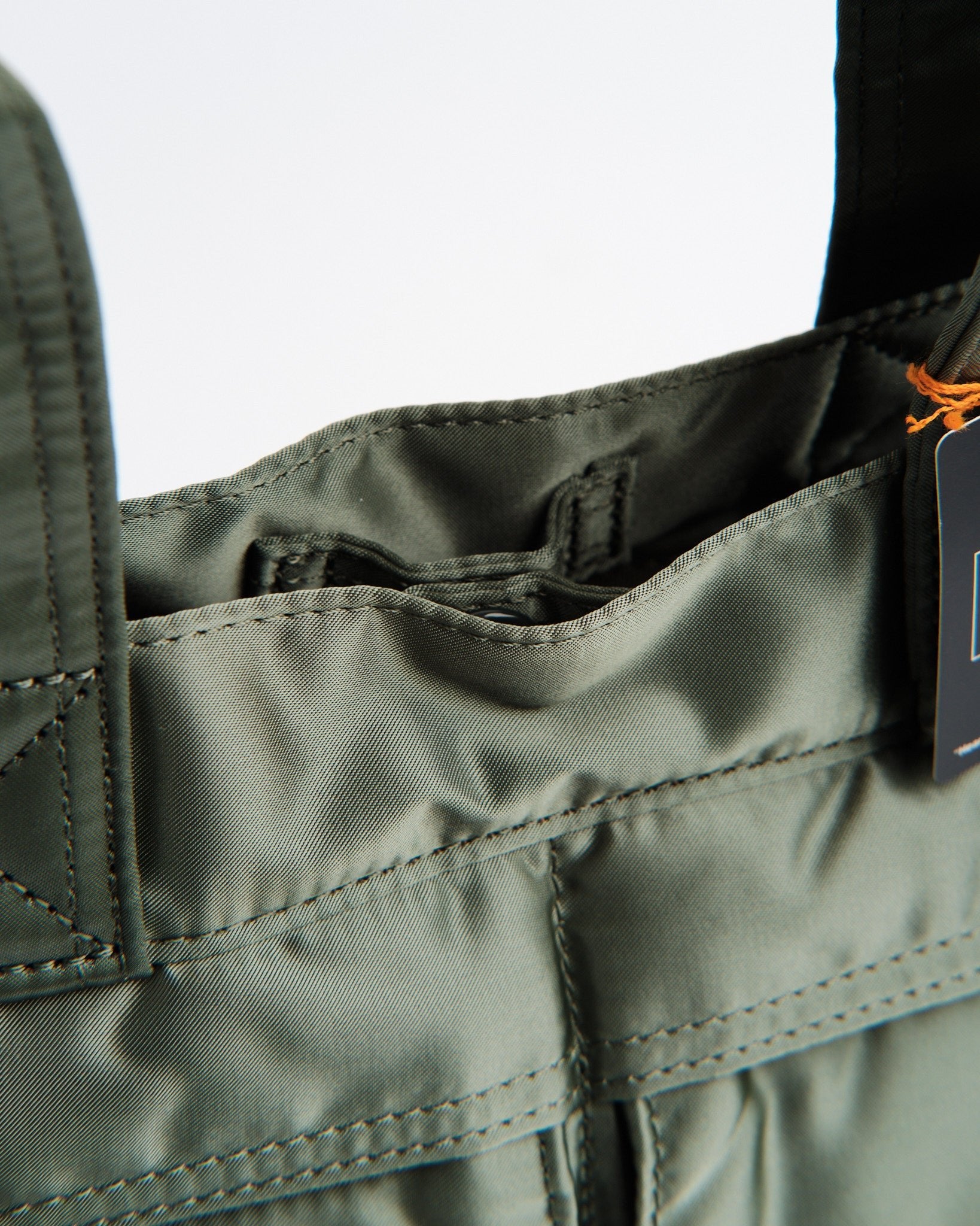 Bekijk de PORTER YOSHIDA 622 76995 30 TANKER TOTE BAG in een SALIEGROENE tint. Deze tas is onderdeel van de Tanker Serie die zijn debuut maakte in 1983 en inspiratie haalde uit de US Air Force vliegjack MA 1. Gemaakt met een drielagige mix van nylon twill polyester katoen en nylon tafzijde is deze tas licht maar stevig. De levendige reddingsoranje voering voegt een pop van kleur toe. Met een horizontaal ontwerp en twee tanker-stijl voorzakken is het geweldig voor het dragen van must-haves zoals een 500ml waterfles of lunchbox. Met afmetingen van B; 340mm, H; 240mm, D; 130mm (B; 13.4in H; 9.4in D; 5.1in) en een gewicht van 325g (11.5oz) biedt het voldoende ruimte zonder in te boeten aan stijl. Handgemaakt, in Japan toont deze tas Yoshida&Co.'s aandacht voor detail.