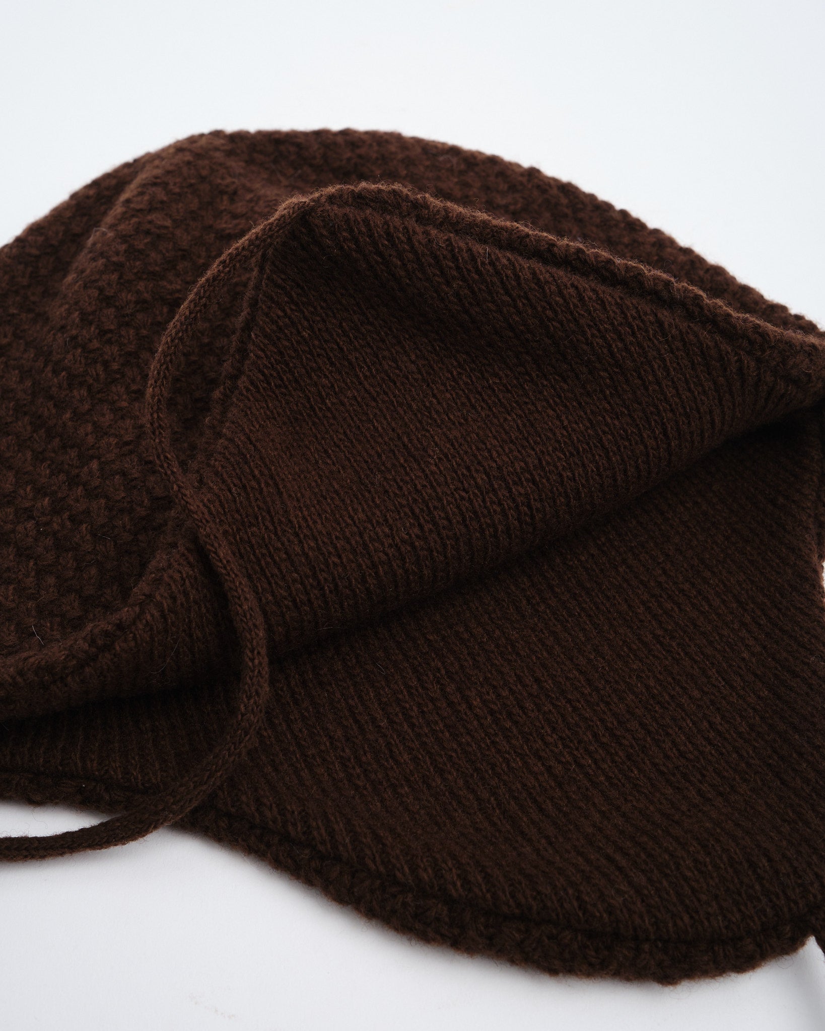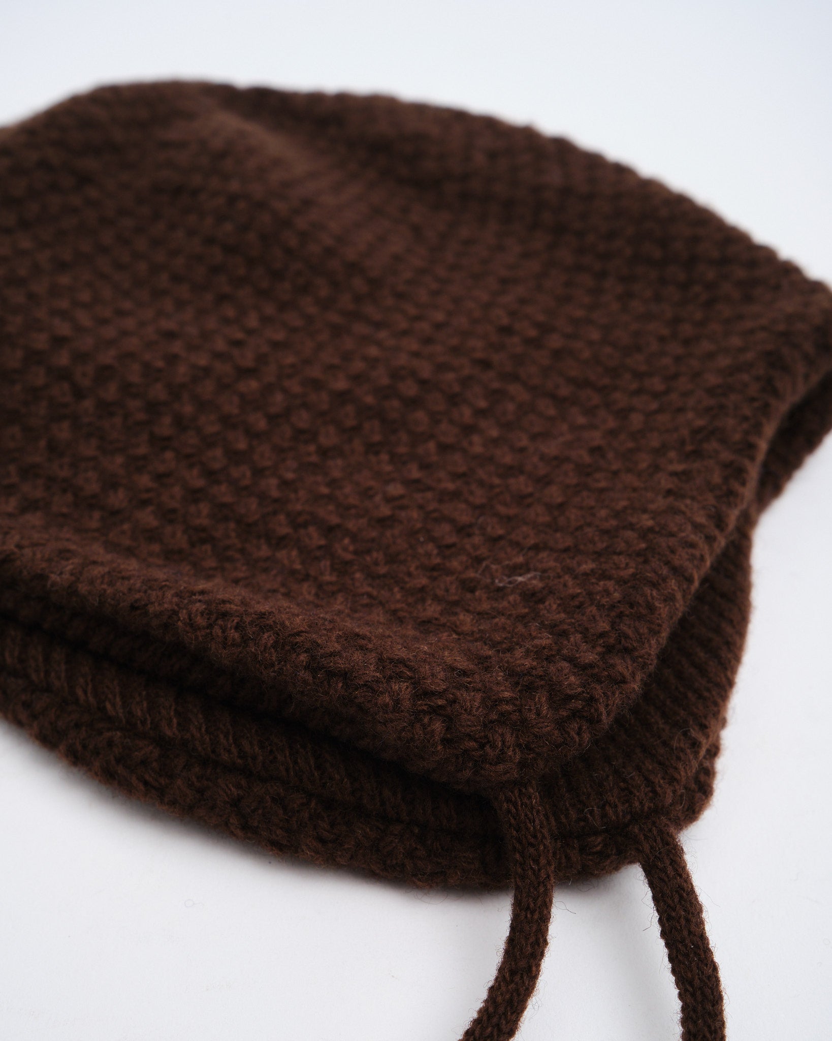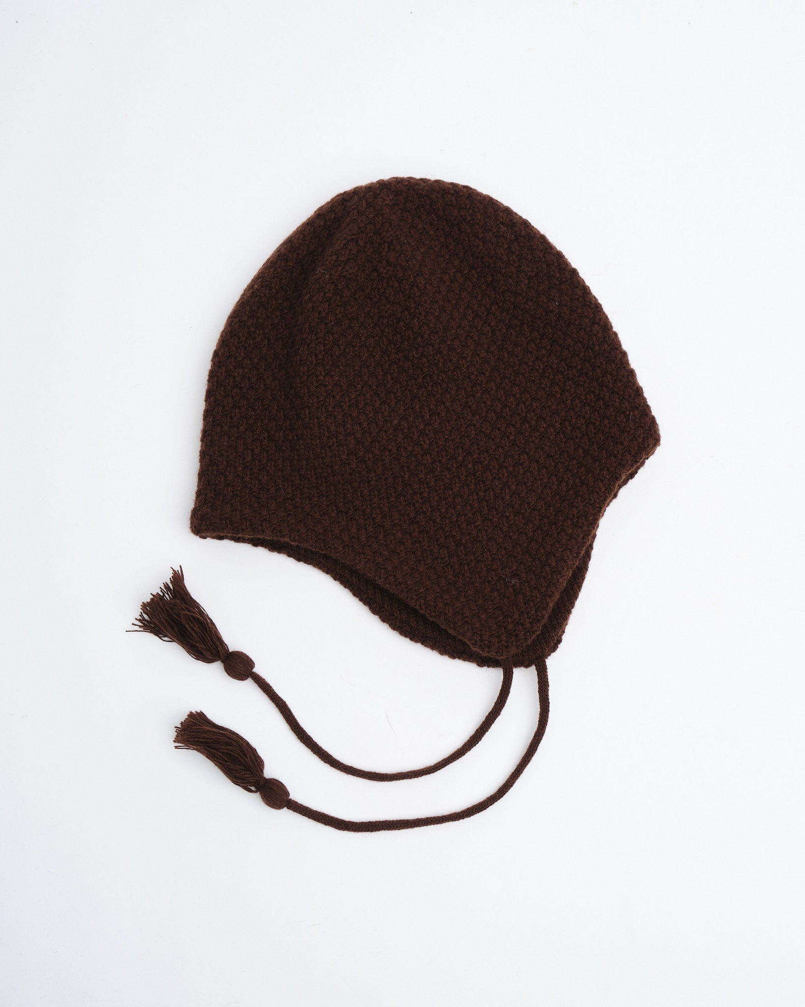 The Trek Beanie in Brown by Found Feather blends rustic charm with refined construction. Made in Japan from a washable lambswool blend, it features a dobby cable knit pattern and a brushed interior for enhanced softness. The extended 8.5 cm ear panels and self-yarn lace and tassels give it a cozy, alpine feel, while the one-panel design ensures a clean fit. Finished with a woven label and QR-coded care tag, this unisex beanie is ready for both mountain air and city chill.