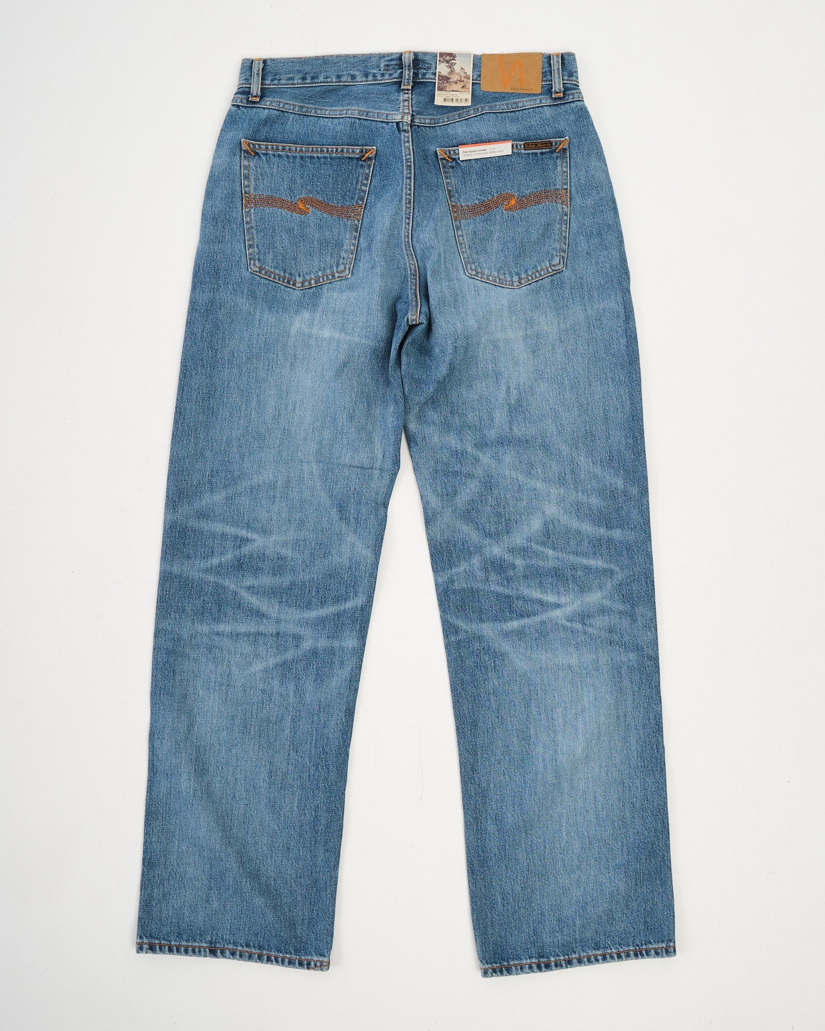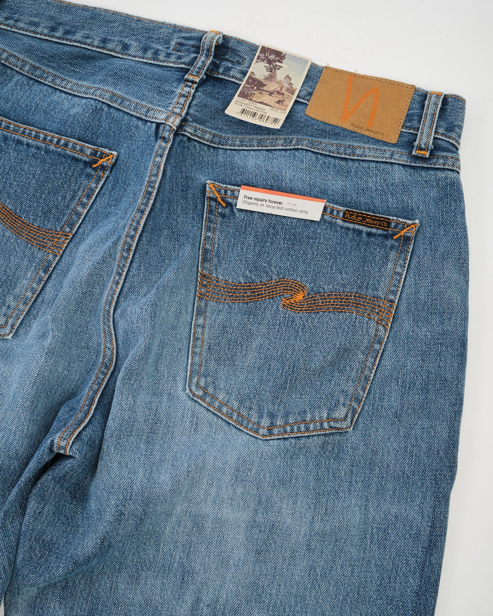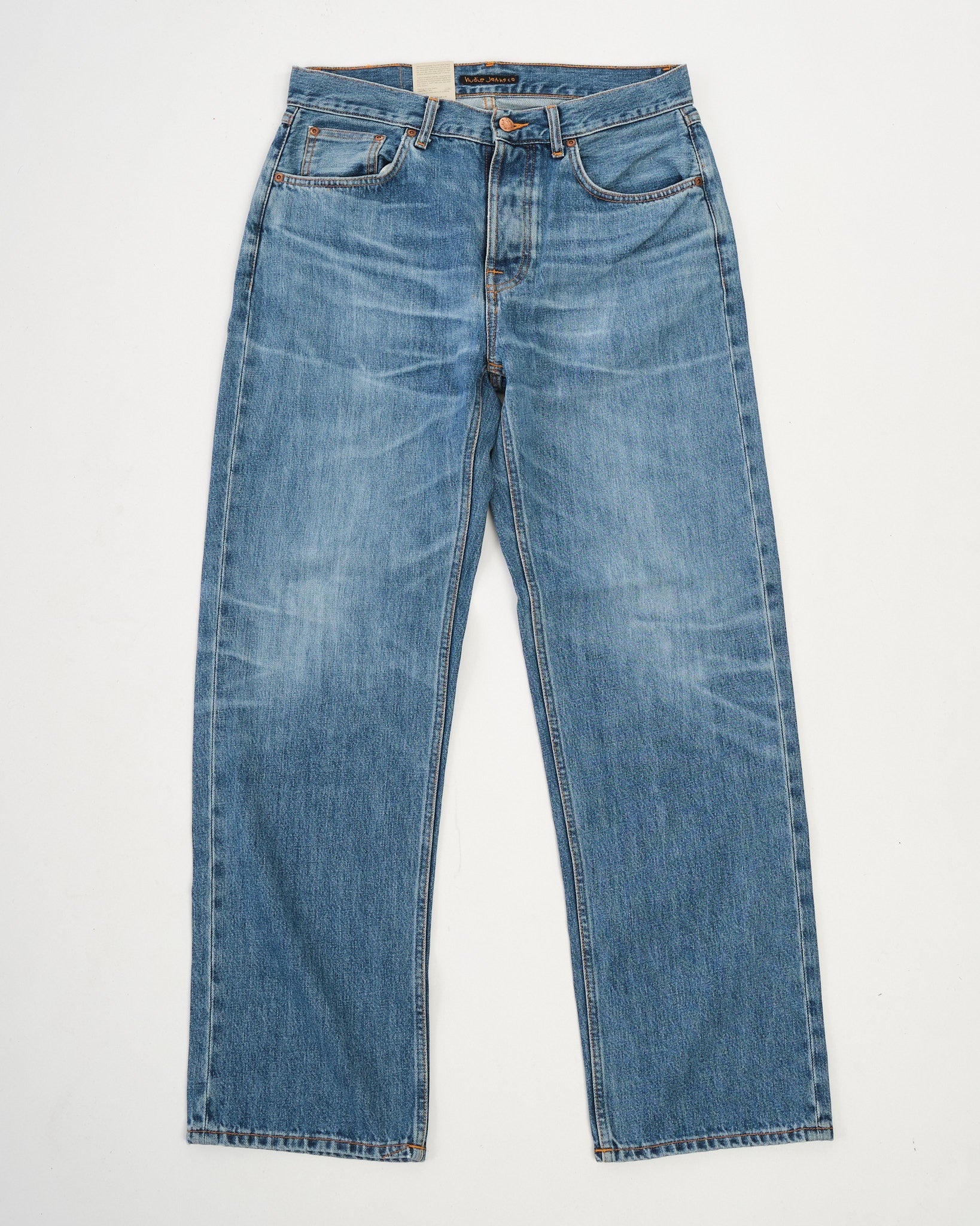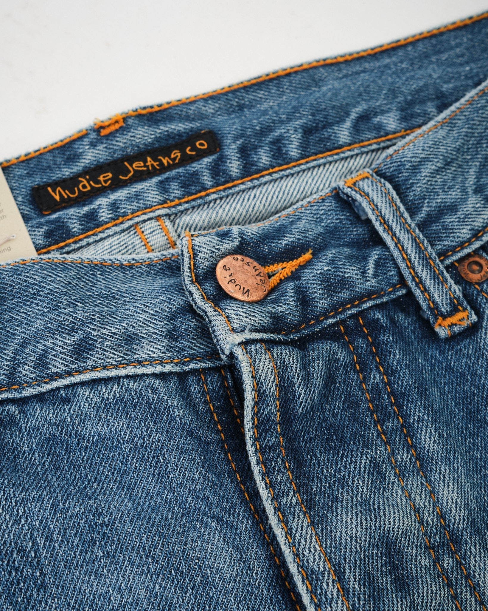 2. Authentieke recreatie van ingedragen Nudie Jeans met realistische verkleuring.