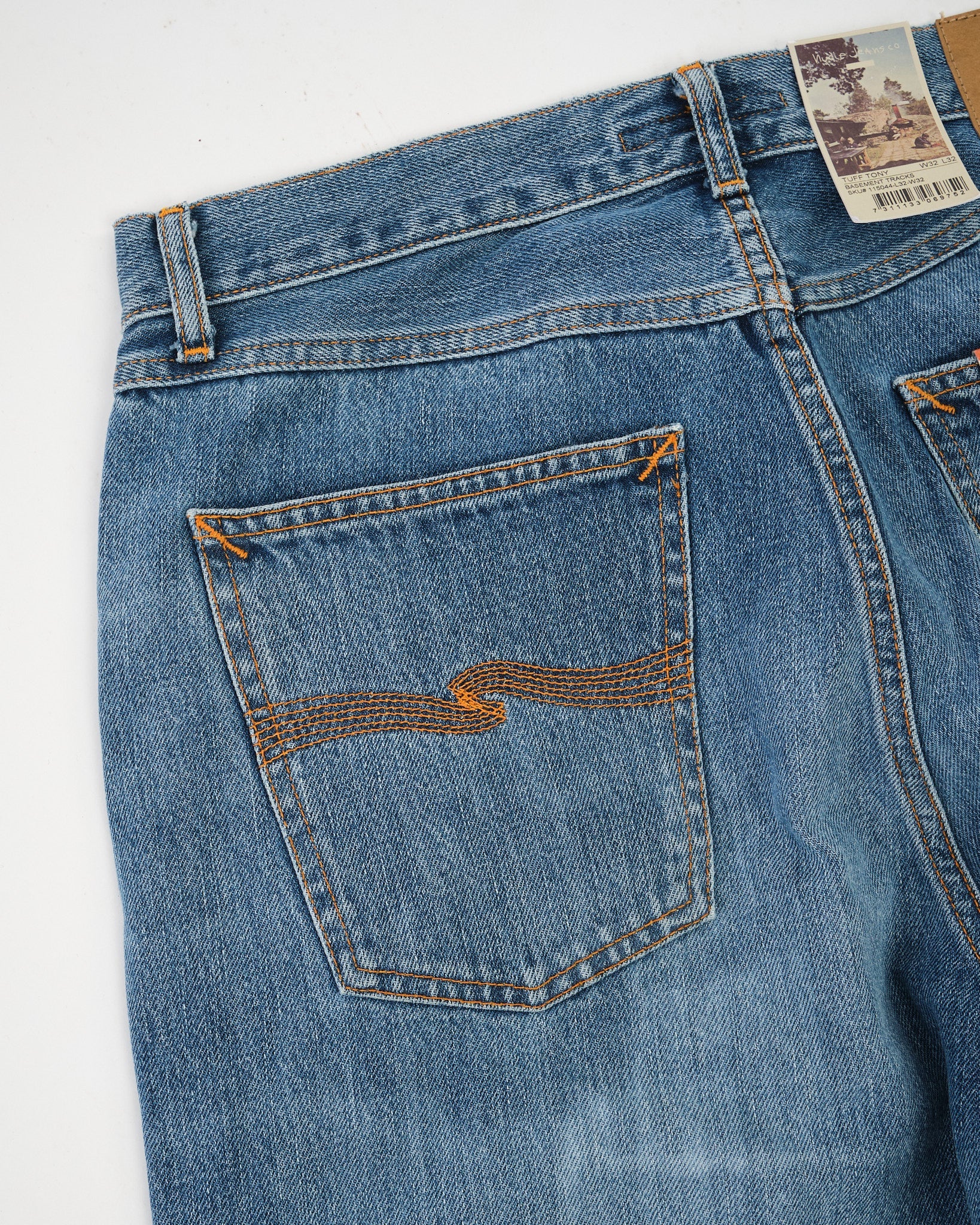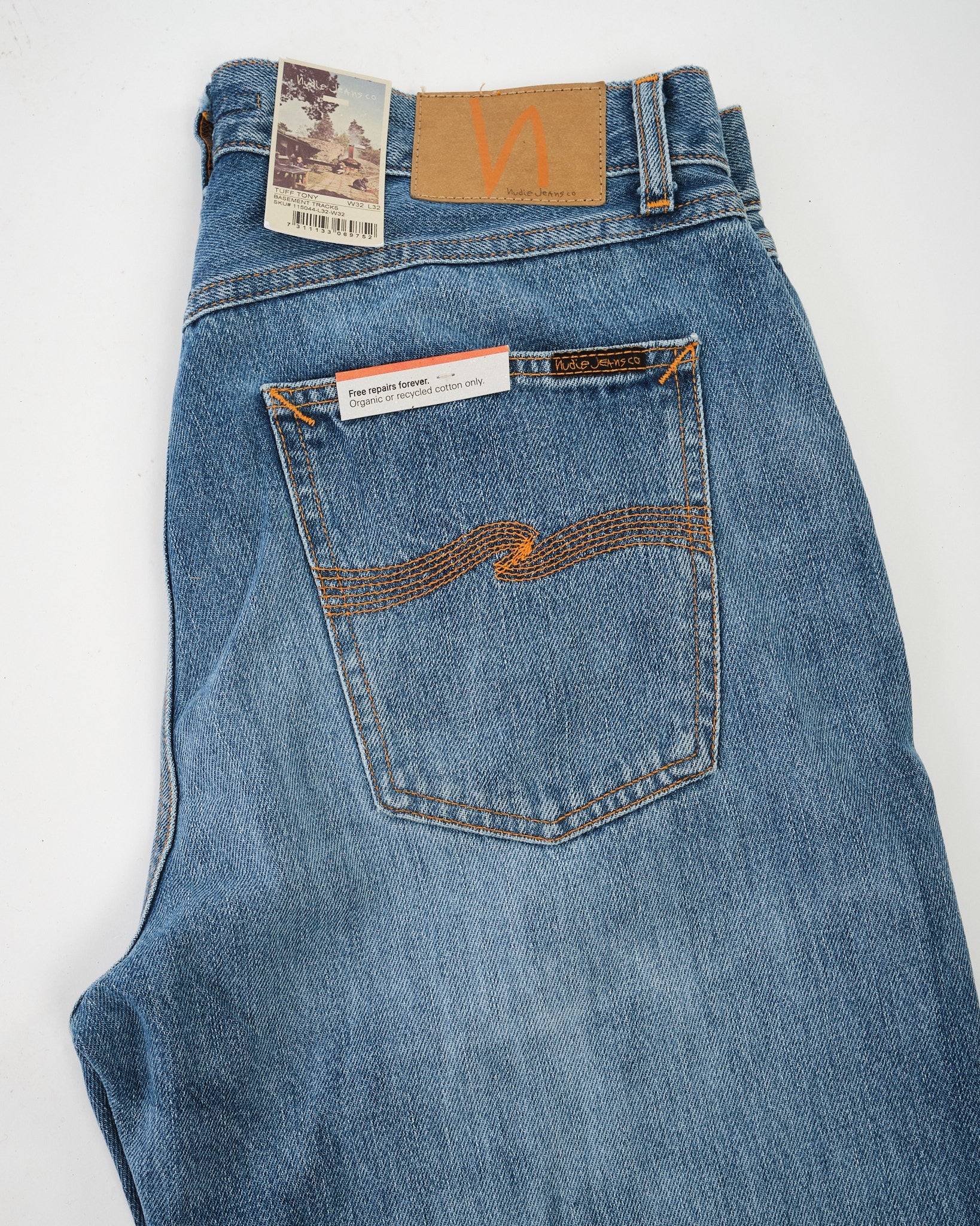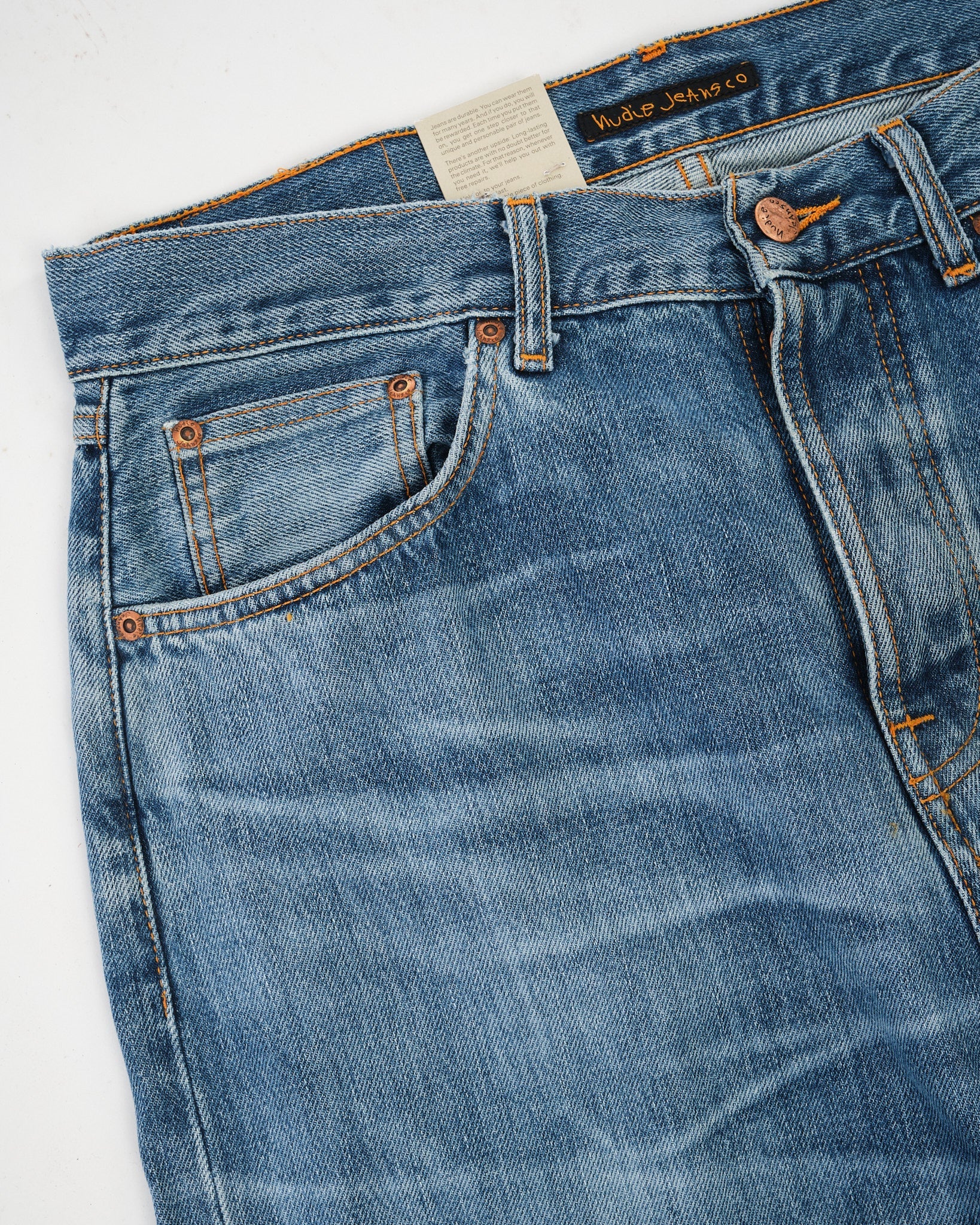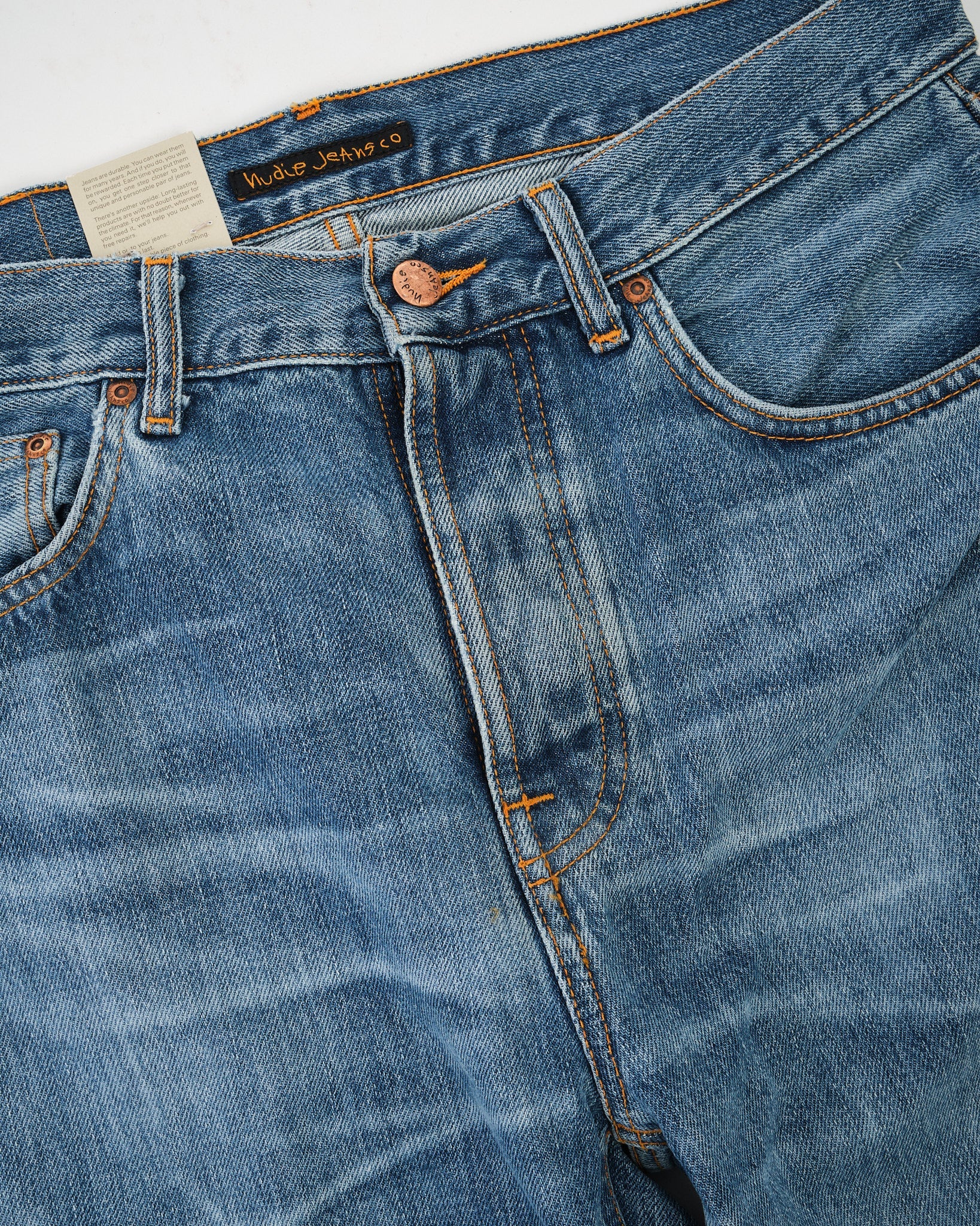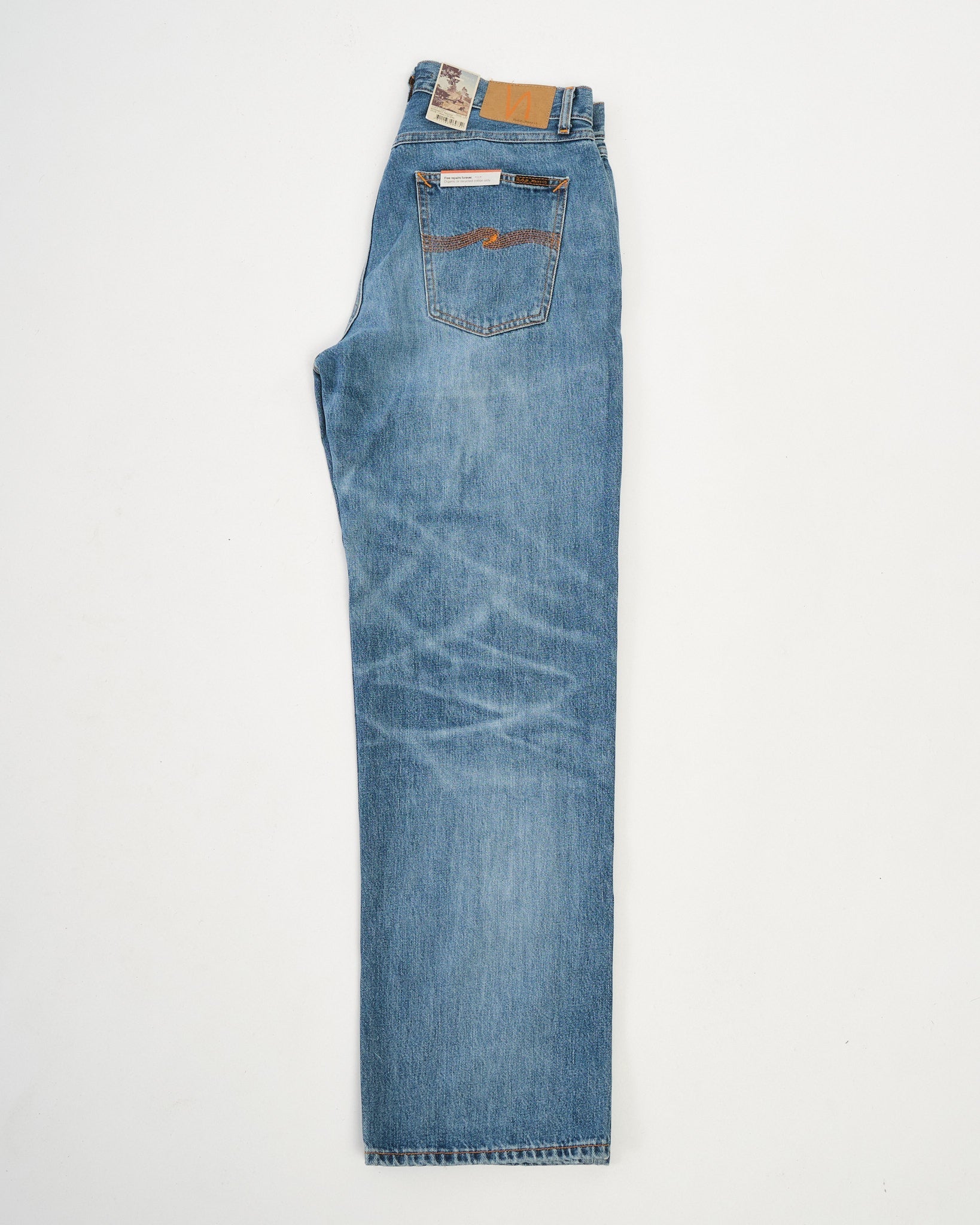 2. Authentieke recreatie van ingedragen Nudie Jeans met realistische verkleuring.