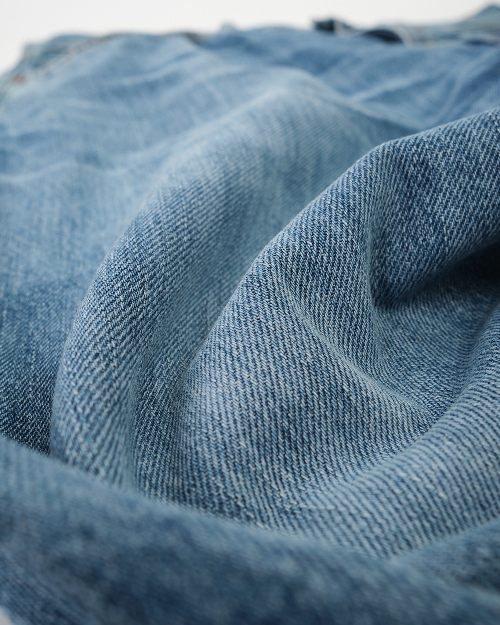 Vervaardigd uit premium denim, hebben deze jeans een helderblauwe indigo wassing met bijna witte highlights en een subtiele warmte die het verouderde effect versterkt. De ruige textuur met opvallende verticale slubs geeft de stof uitzonderlijke diepte, terwijl het marmerachtige patroon contrast toevoegt in de donkere gebieden. De realistisch gerepliceerde verkleuring en distressing creëren vanaf dag één een oprecht ingedragen look.