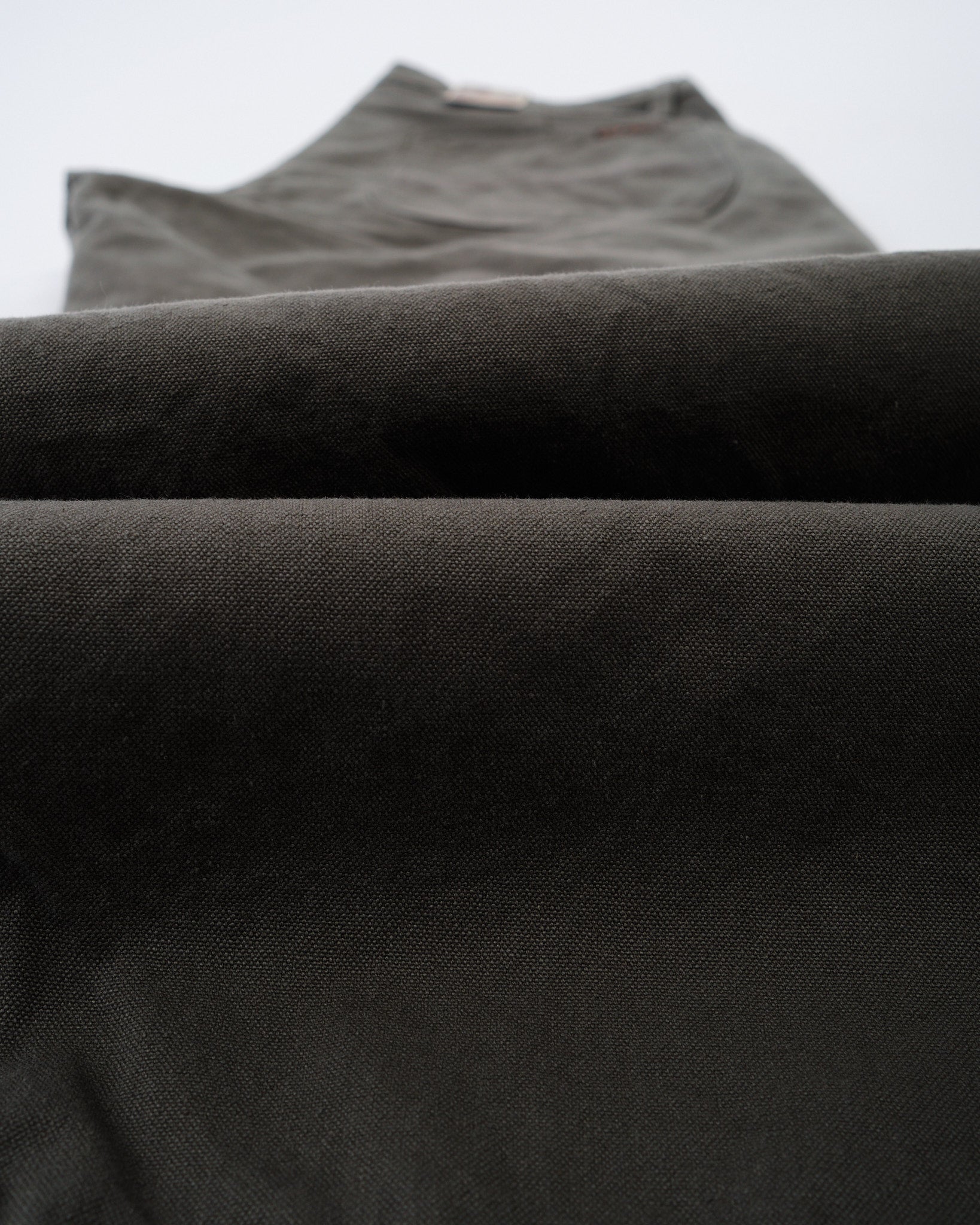 Vervaardigd uit Duck Canvas, een bleek dennengroen 2-laags canvasweefsel, is deze stof een eerbetoon aan erfgoed vakmanschap. Met gebruik van onregelmatige ringgesponnen garens verdraaid tot duurzame 2-laags draden, is het canvas garengeverfd door een gepatenteerd proces, wat zorgt voor een rijke, zich ontwikkelende patina. De strak geweven structuur creëert een stevig, zeer textuurrijk oppervlak, dat natuurlijke imperfecties viert terwijl het superieure duurzaamheid biedt.