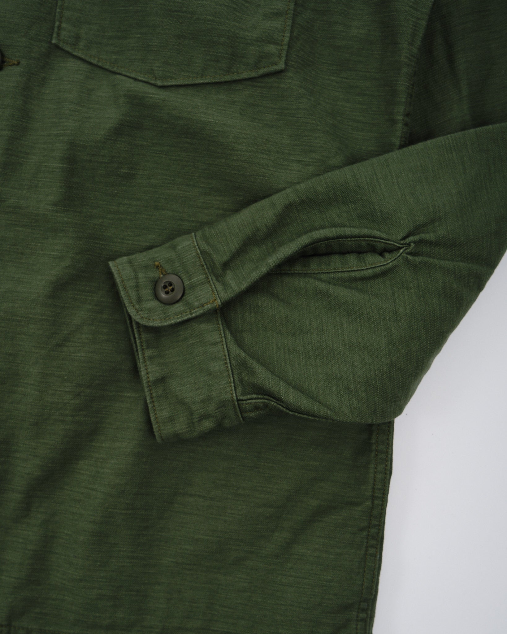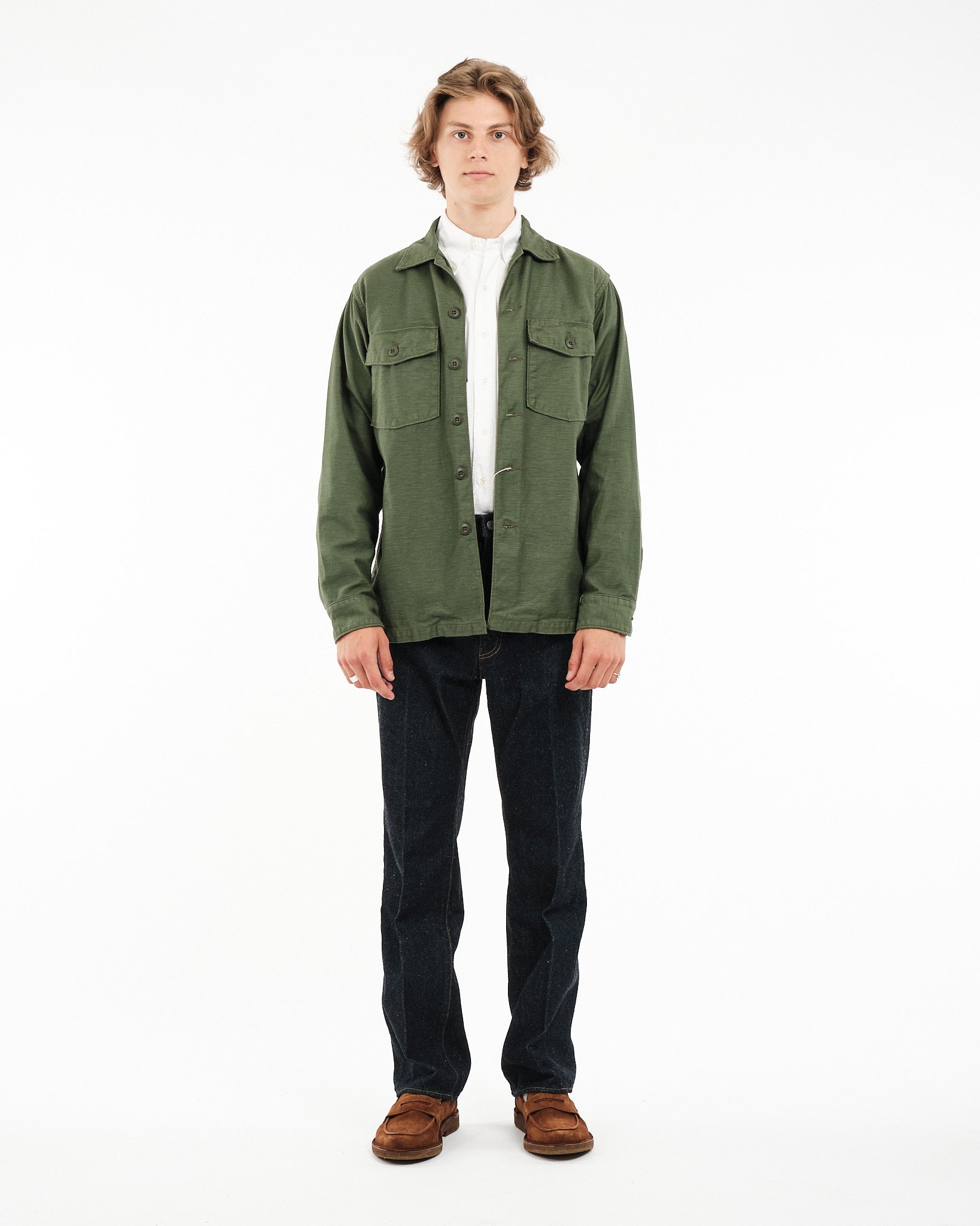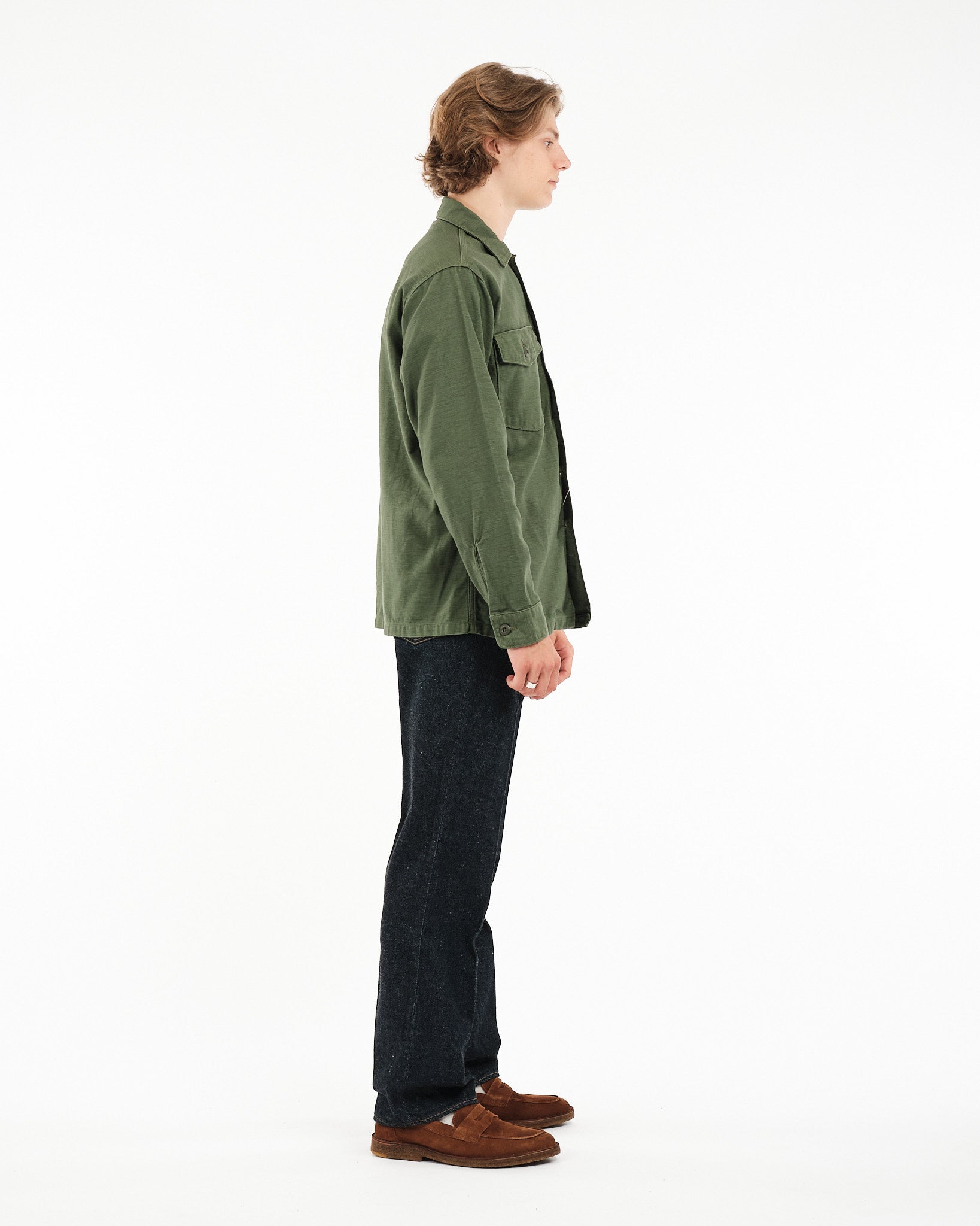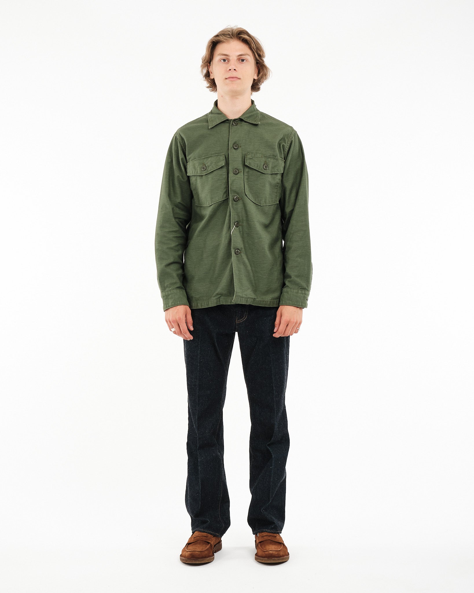 Vier de militaire geschiedenis met orSlows US ARMY FATIGUE SHIRT in GROEN, stijlcode 03 8045 16. Dit tijdloze stuk is geïnspireerd op de iconische Utility Shirts van het Amerikaanse leger uit de jaren 1960. Het belichaamt een blijvende stijl en duurzaamheid. Met veel zorg vervaardigd uit reverse sateen stof, beginnend bij de draadfase, ontwikkelt dit shirt in de loop van de tijd een unieke patina met horizontale vervaging die karakter toevoegt bij elke wasbeurt en dragen. Zijn veelzijdigheid maakt het perfect voor laagjes tijdens de herfst en lente of als een binnenlaag tijdens de winter. Een must-have garderobe essentieel, voor wie traditie en praktisch nut waardeert.