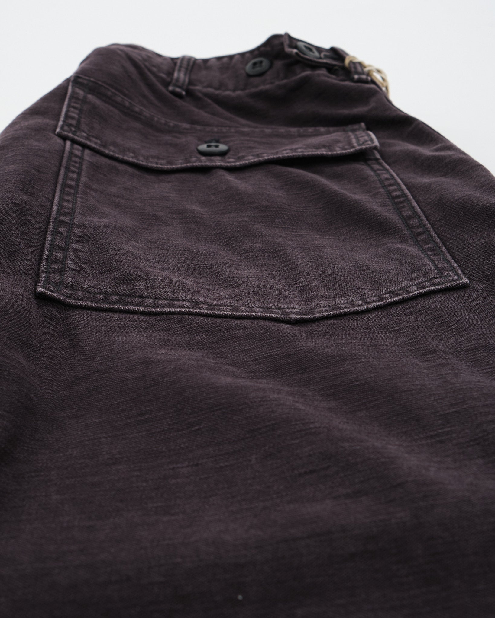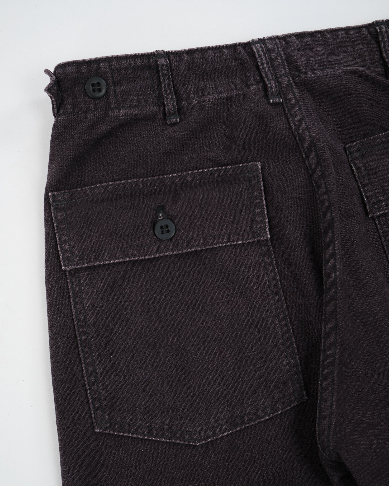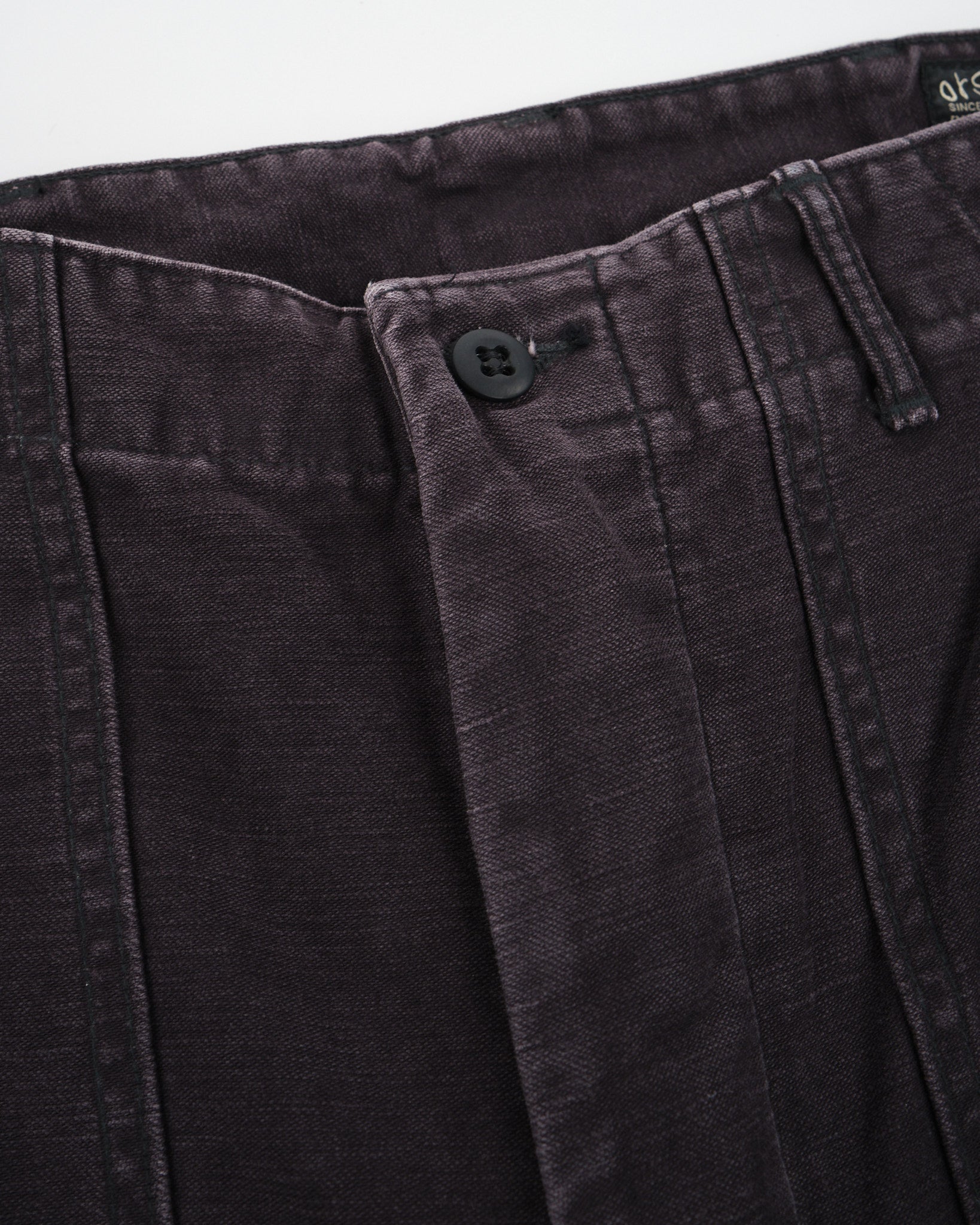 De orSlow US Army Fatigue Pants Regular Fit in Black Stone zijn een hedendaagse hommage aan klassieke militaire werkkleding, die duurzaamheid combineert met tijdloze stijl. Vervaardigd uit 100% katoen reverse sateen stof, bieden deze broeken een unieke textuur en robuuste constructie. De reguliere pasvorm zorgt voor comfort en gemak van beweging, terwijl de verstelbare taille tabs een aanpasbare pasvorm mogelijk maken. Met twee diepe zijpatch zakken en achterzakken met flap sluiting, bieden ze praktische opbergoplossingen. De steengewassen zwarte kleur voegt een vintage aantrekkingskracht toe, waardoor ze veelzijdig zijn voor verschillende outfits. Gemaakt in Japan, weerspiegelen deze broeken orSlow's toewijding aan kwaliteitsvakmanschap.