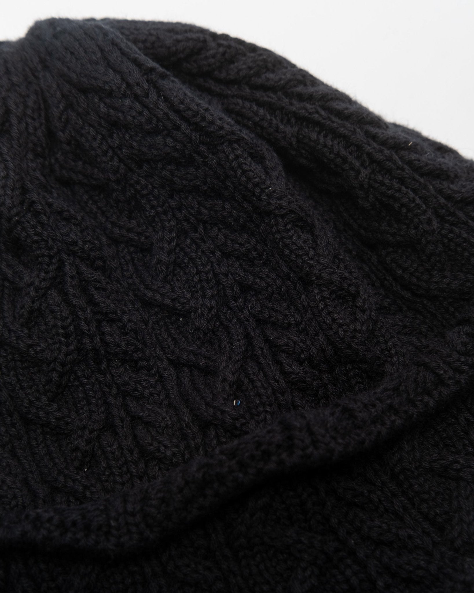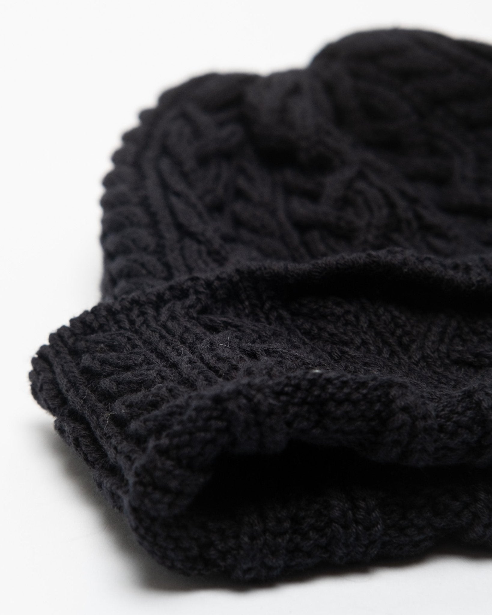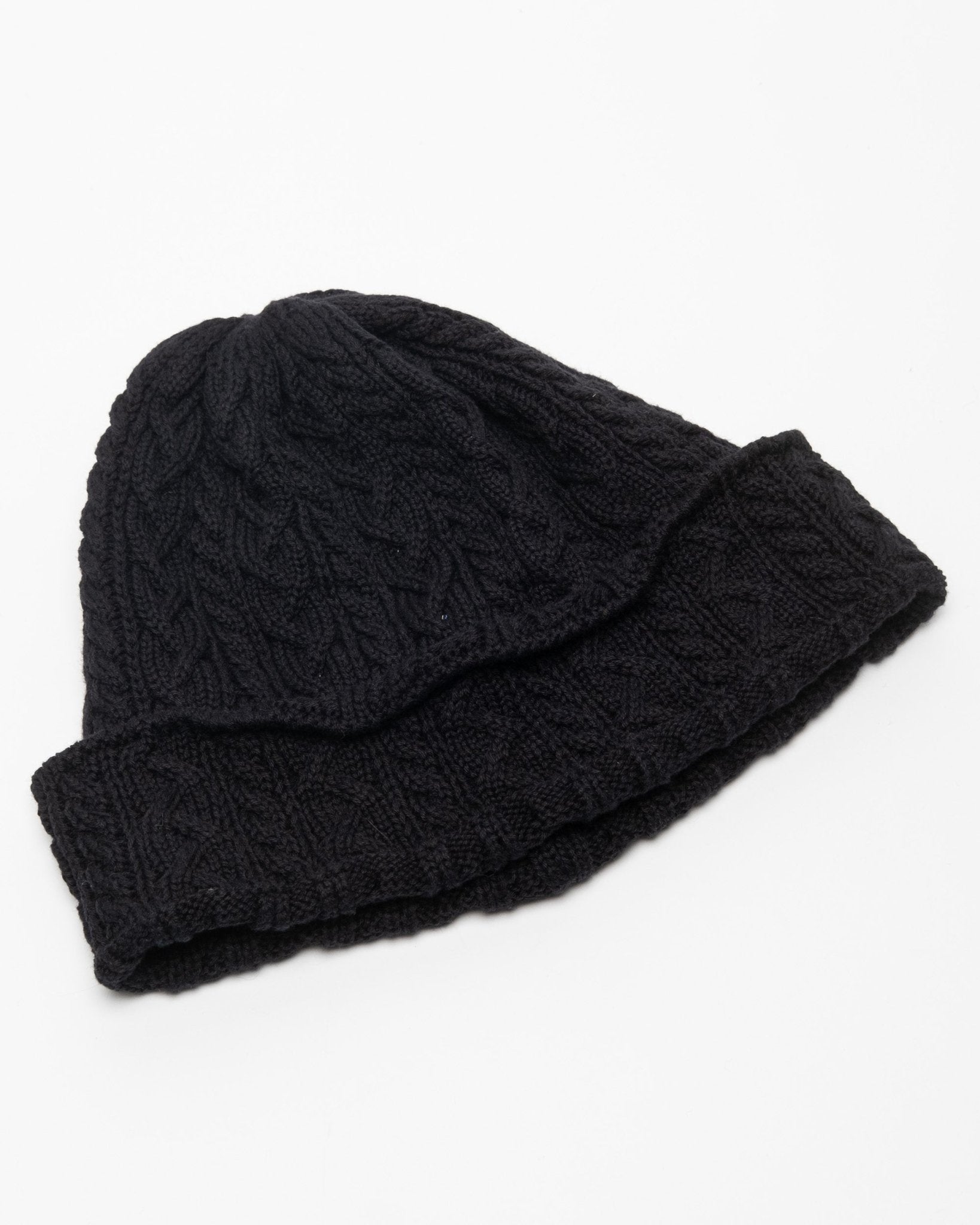 Fisherman Cable Knit Hat Zwart van Found Feather. Een nauwsluitende, dikgebreide muts, gemaakt van 100% merinowol. Gemaakt in Japan.