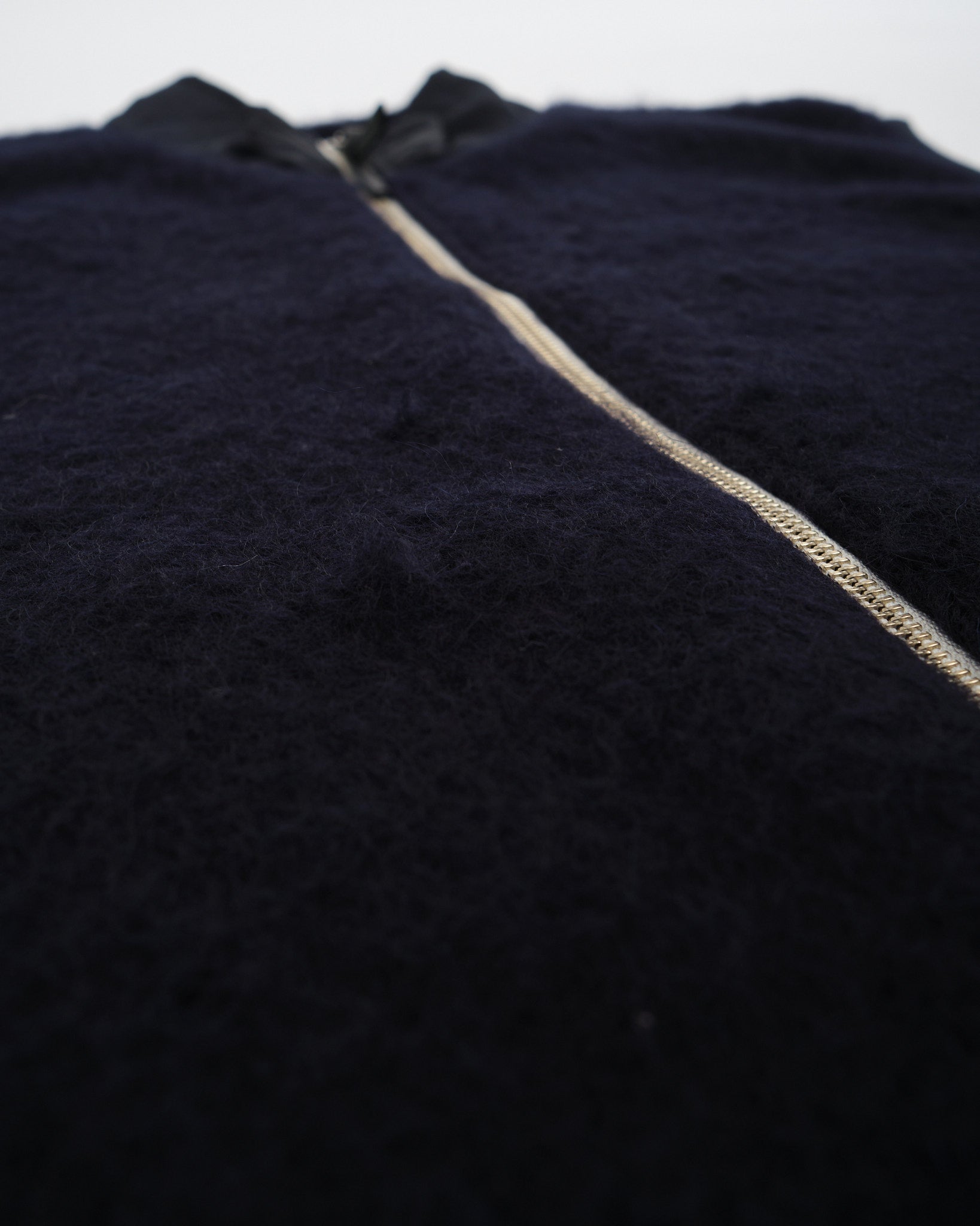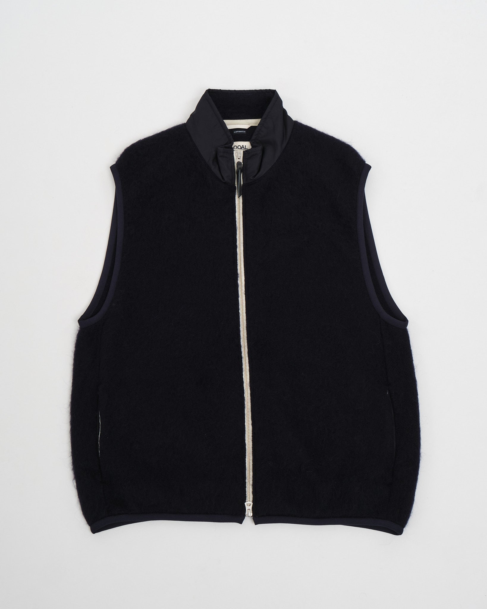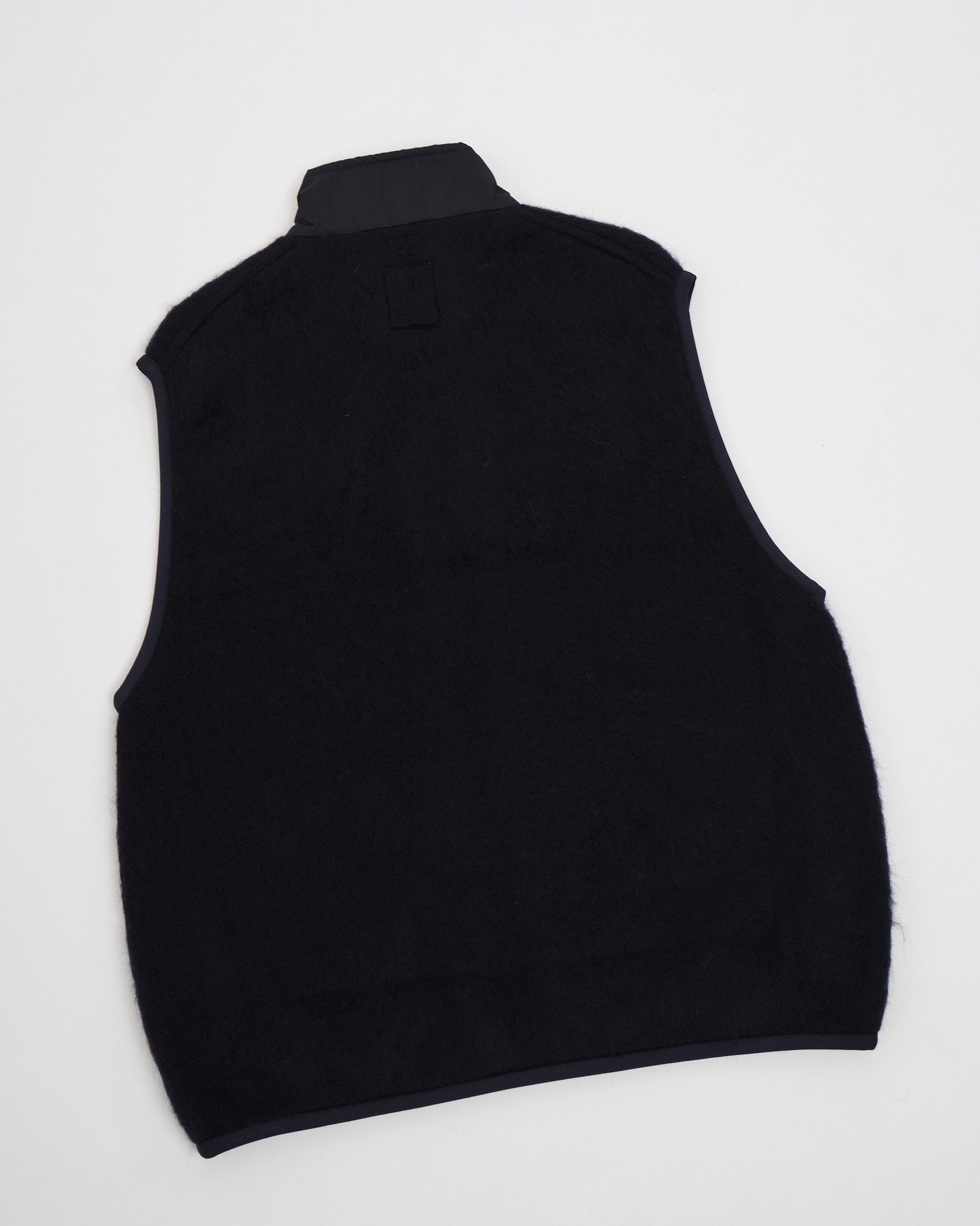 Domple jezelf in de ongeëvenaarde warmte en comfort van de Nanamica Zip-Up Mohair Vest in Navy. Dit stuk is vervaardigd met garen afkomstig van ruwe mohair, afkomstig van boerderijen die zich strikt wijden aan duurzame productiepraktijken, en zorgvuldig verwerkt in Japan. De verhoogde vezelafwerking geeft het vest een volume dat doet denken aan outdoor wear fleece. Geïnspireerd door het iconische fleece vest uit de jaren 90, ondergaat dit vest een moderne transformatie om een minimalistisch ontwerp te omarmen. Met zijn oversized silhouet belooft het een ontspannen, vrij vloeiende pasvorm voor elke gelegenheid.